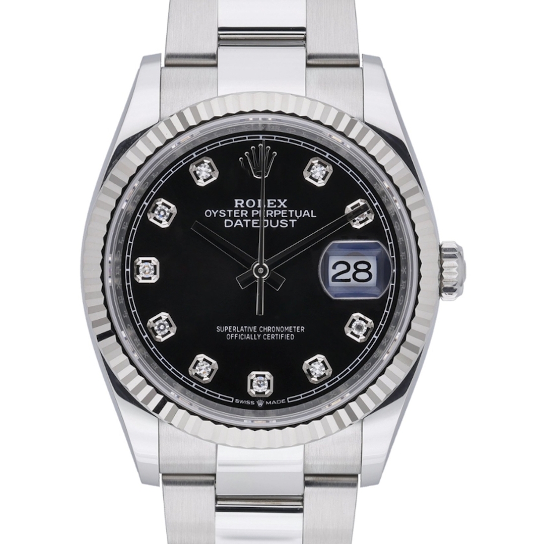 A Rolex Datejust 36 reference 126234, crafted in stainless steel and paired with an 18ct white gold fluted bezel, presented on a black dial set with original Rolex diamond numerals. The contrast between the dark dial and the brilliance of the diamonds creates a refined yet confident aesthetic. At the same time, the classic 36mm case size delivers timeless proportions suited to both formal and everyday wear.