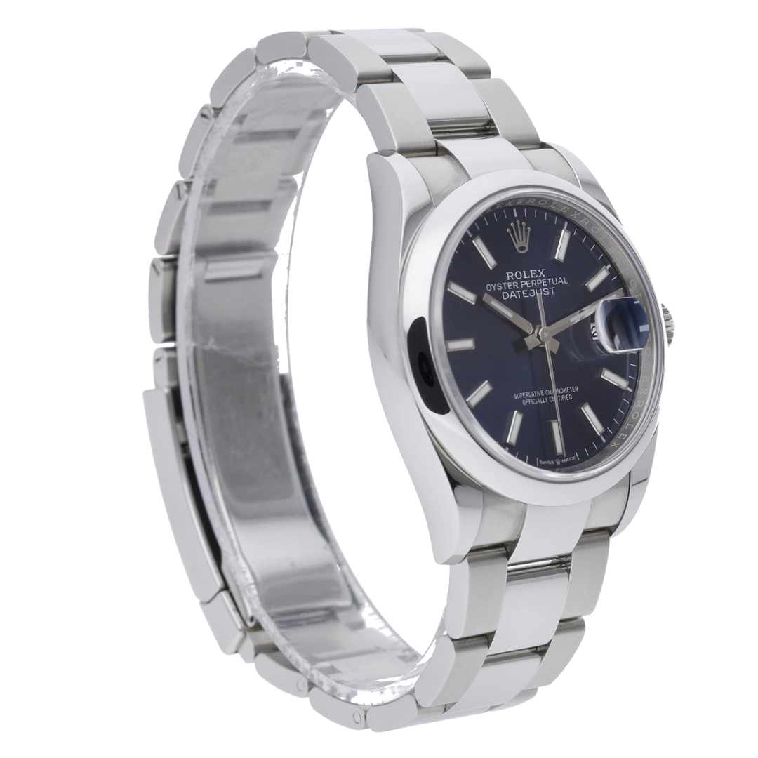 A Rolex Datejust 126200 is presented in stainless steel with a striking blue sunburst dial, offering a clean and contemporary take on this classic model. The 36mm Oyster case provides a balanced and wearable profile, while luminous baton hour markers and the Cyclops-enhanced date display ensure excellent everyday legibility. The smooth bezel and Oyster bracelet contribute to its refined and understated aesthetic.