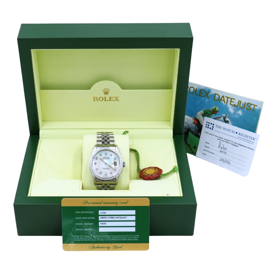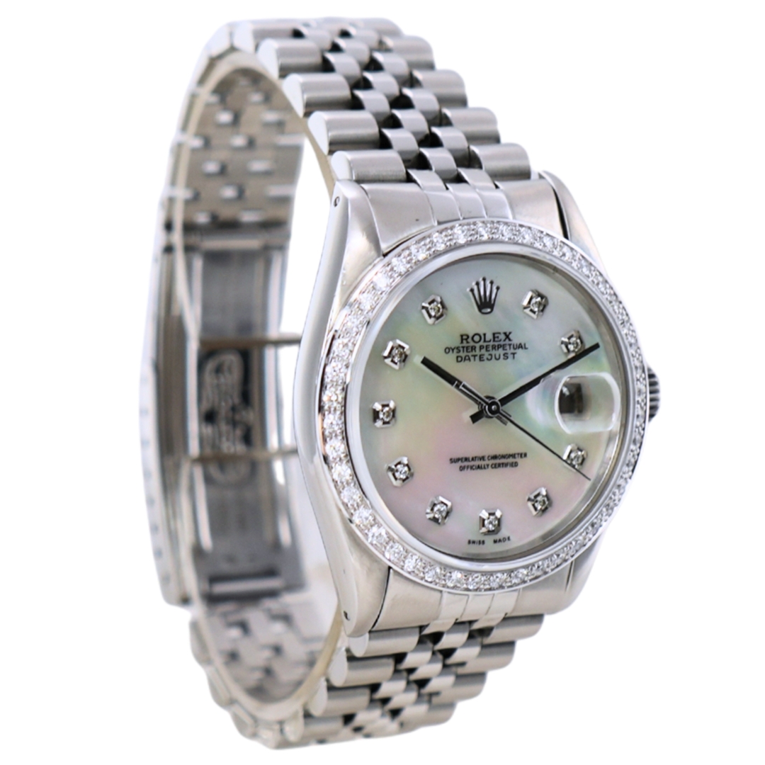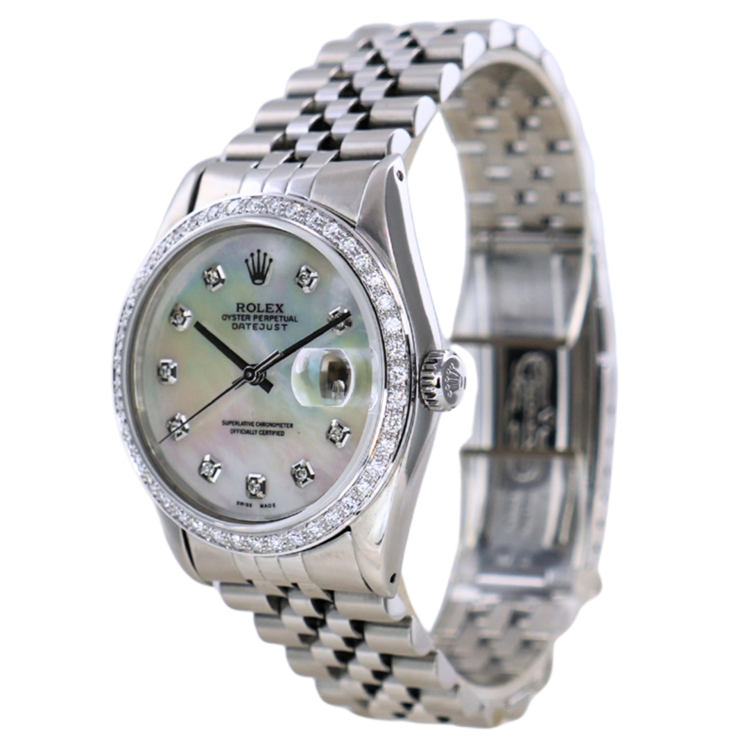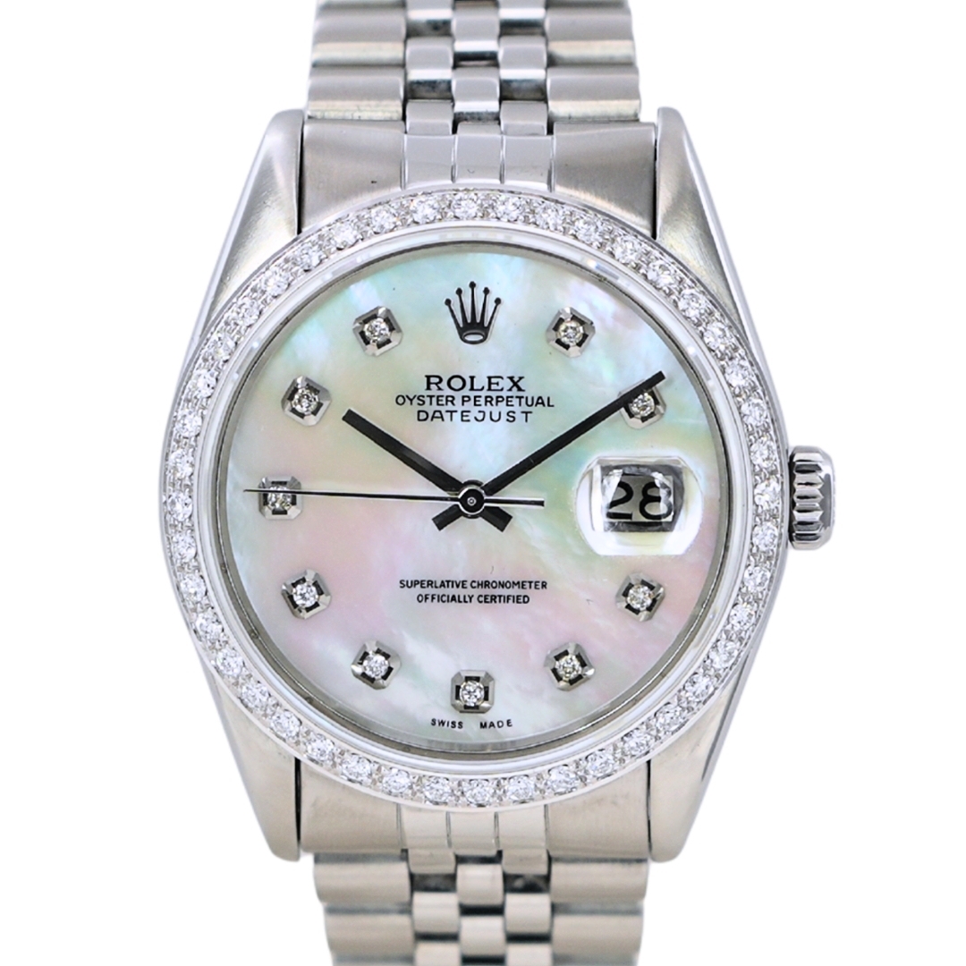 A Rolex Datejust Watch, crafted in stainless steel and paired with an afterset diamond bezel that adds a refined sense of brilliance to this classic 36mm reference. The afterset mother-of-pearl dial displays vibrant iridescence, complemented by diamond-set numerals that elevate the watch’s elegant character. Its iconic Datejust proportions and timeless Jubilee bracelet complete a look that remains effortlessly sophisticated.