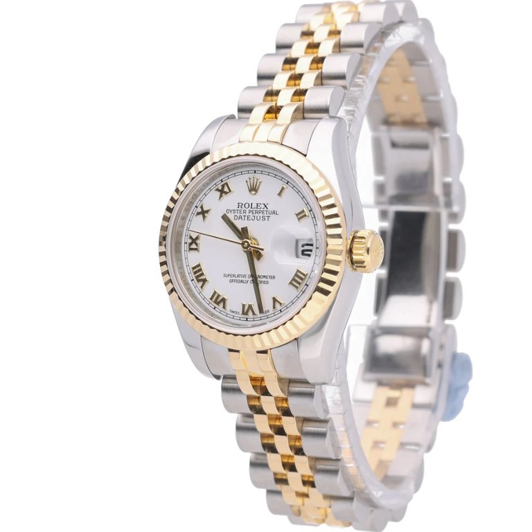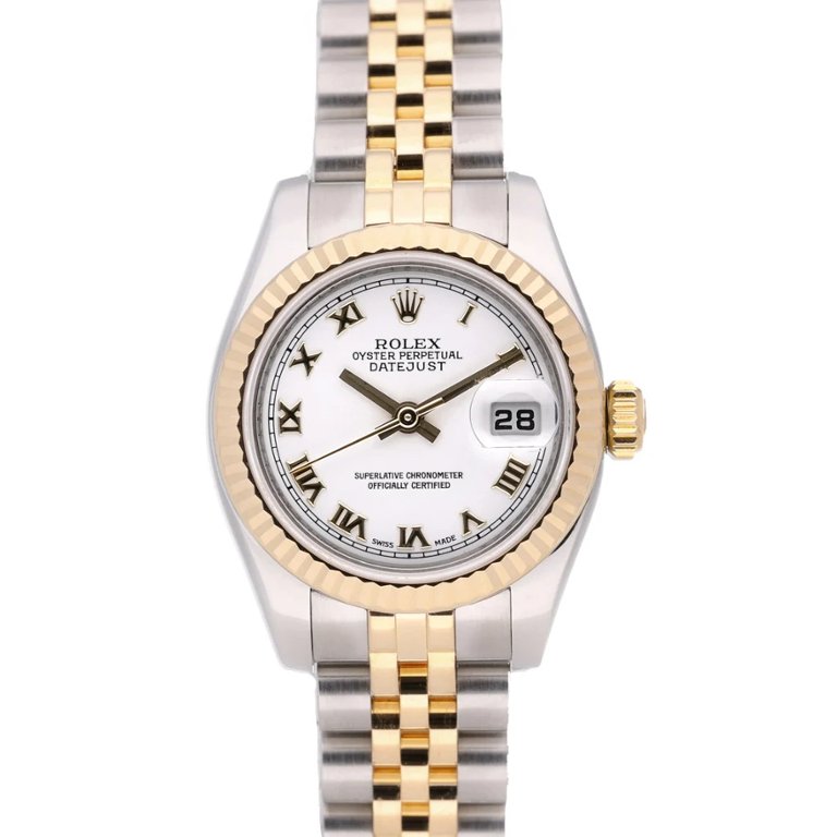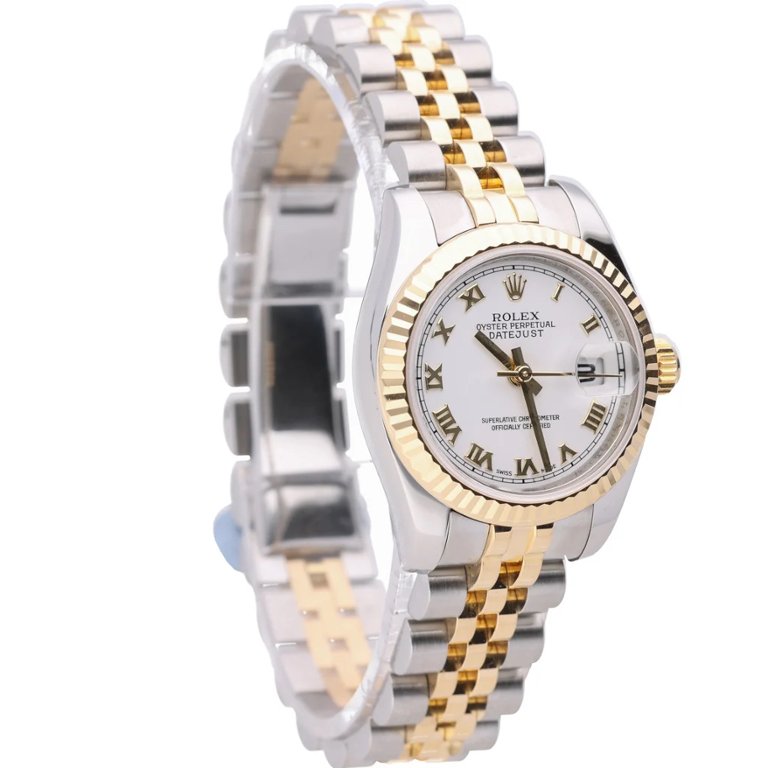 A Rolex Datejust Watch, model 179173, presented in immaculate condition. This 2014 reference combines stainless steel with 18ct yellow gold, complemented by a yellow gold fluted bezel and a crisp white dial with classic Roman numerals. The compact 26mm case delivers timeless proportions, making this configuration a refined and enduring expression of the Datejust line. It is supplied boxed and certified, and accompanied by a 12-month WLC warranty.