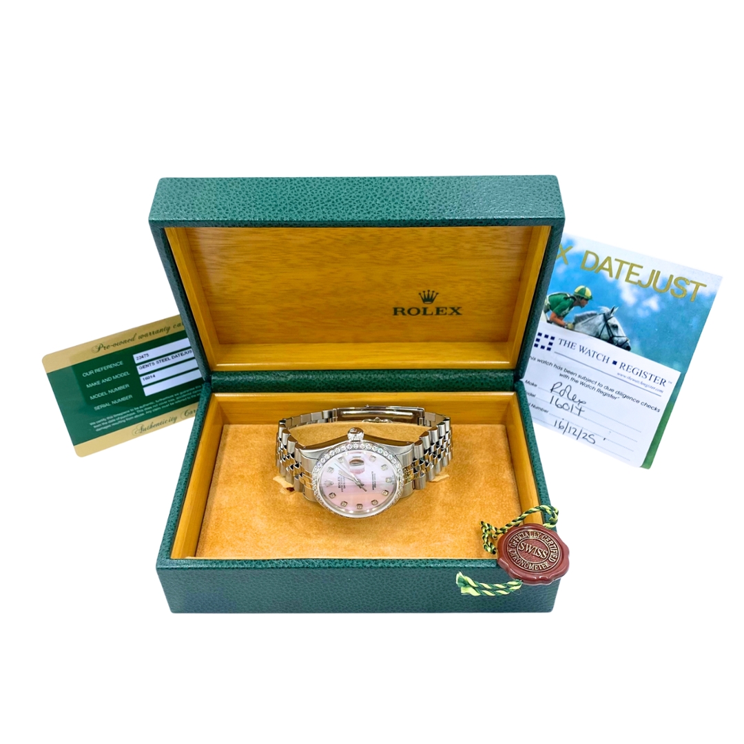 A Rolex Datejust Watch, Stainless Steel with an Afterset Diamond Bezel & an Afterset pink Mother of Pearl Dial with Diamond Numerals.