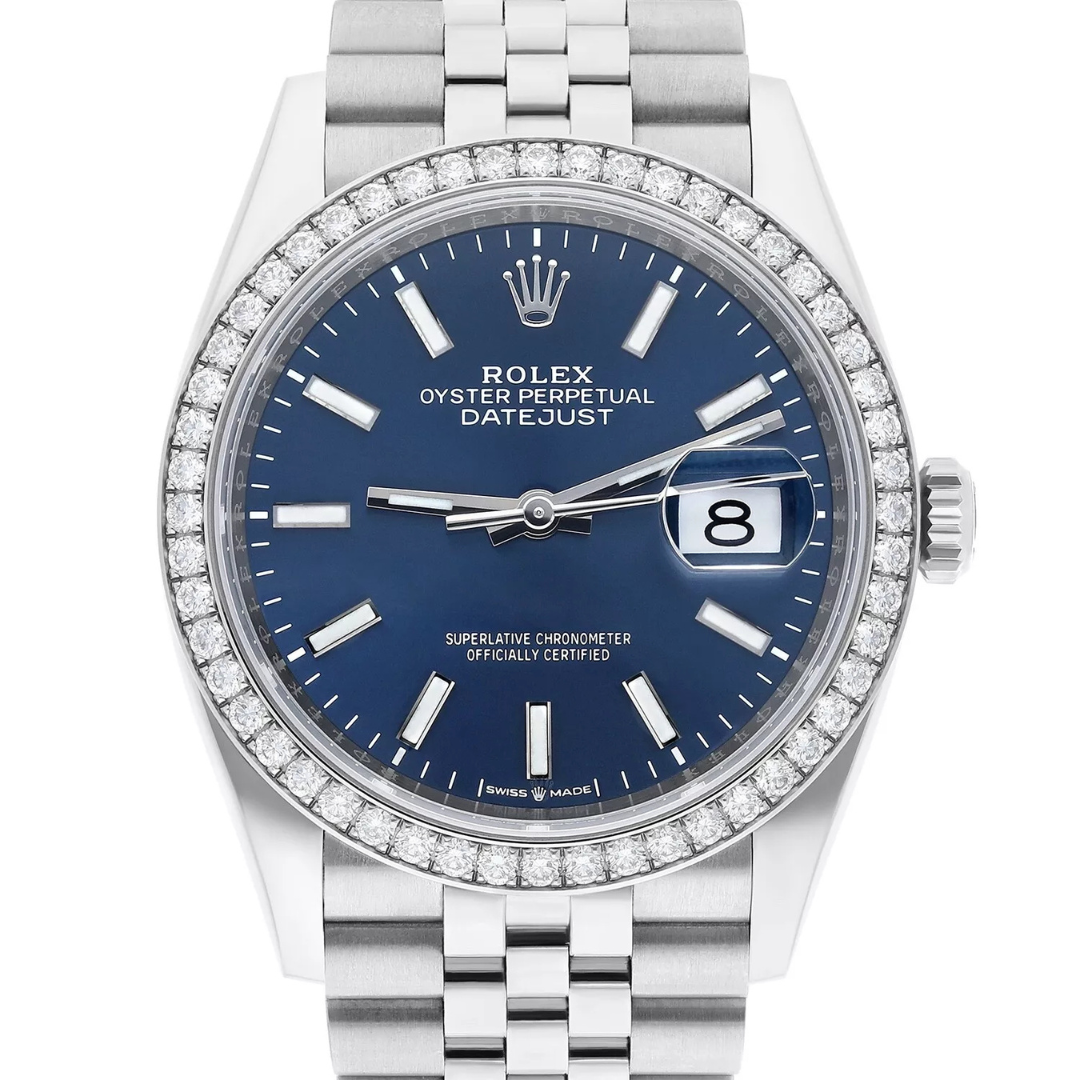 A Rolex Datejust Watch, model 126284RBR, presented in immaculate condition. This 2020 reference is crafted in stainless steel and paired with an 18ct white gold factory diamond-set bezel, framing a rich blue dial with applied baton hour markers. The 36mm Oyster case offers classic proportions and everyday versatility.