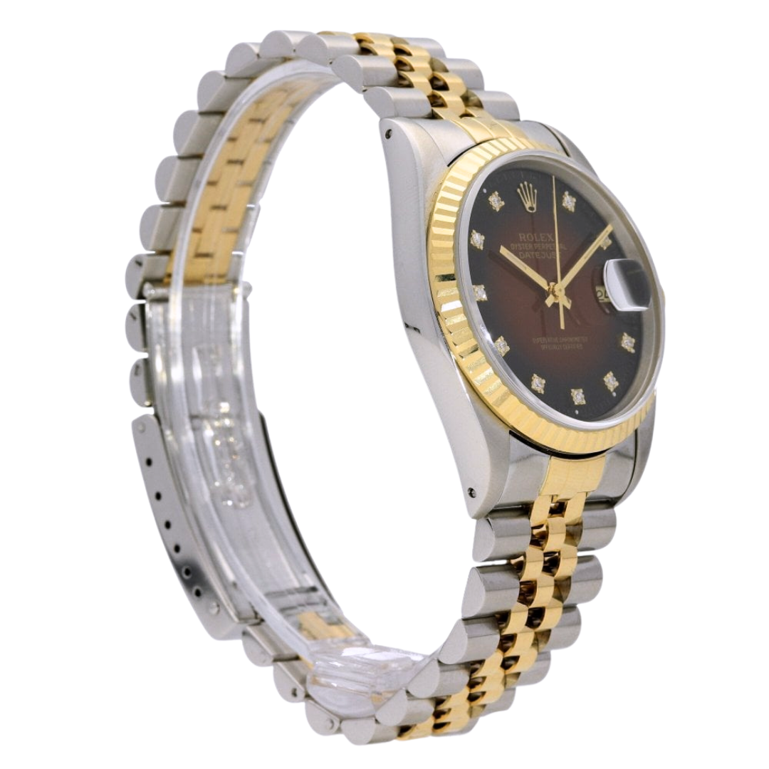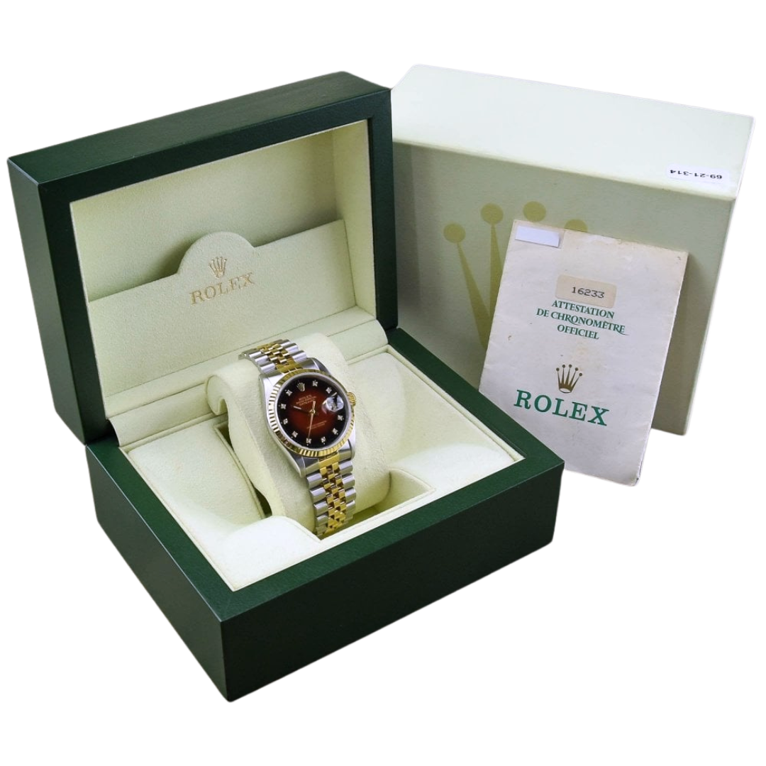 The 16233 represents one of the most enduring Datejust configurations, combining everyday versatility with unmistakable Rolex presence. The warm tones of the bi-metal case and bracelet contrast beautifully with the rich red dial. At the same time, the diamond dot markers add a subtle layer of refinement without overpowering the design.