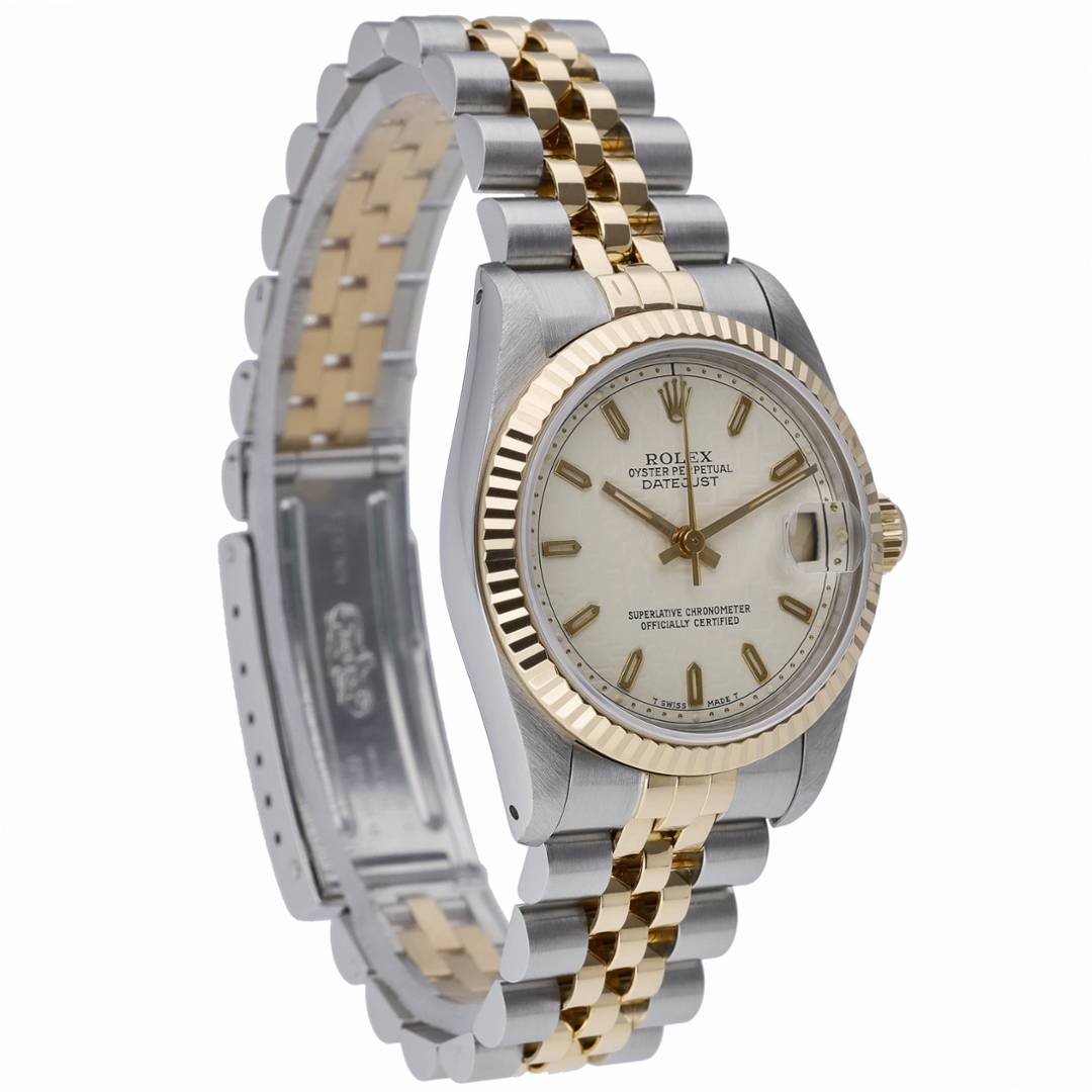 A Rolex Datejust 68273, presented in stainless steel and 18ct yellow gold with an 18ct yellow gold fluted bezel and a classic cream dial with baton hour markers. The 31mm case offers elegant proportions, while the warm tones of yellow gold contrast beautifully with the soft dial colour, creating a timeless, understated aesthetic synonymous with the Datejust line.