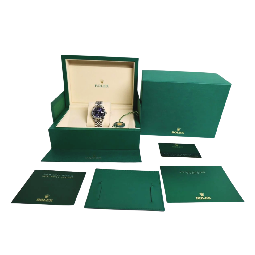 A Rolex Datejust 31 watch in stainless steel with an 18ct white gold fluted bezel, presented on a striking purple dial adorned with an original Rolex diamond-set VI numeral. Model number 278274, this 2025 example is powered by the refined Rolex Calibre 2236 automatic movement, offering superb precision, a 55-hour power reserve, and the reliability expected from a Superlative Chronometer. The 31mm case provides a perfect balance of elegance and presence, complemented by the iconic Jubilee bracelet for enduring comfort and sophistication.