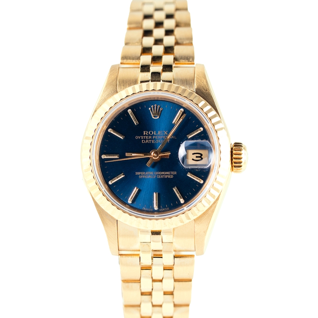 This 1999 Rolex Datejust reference 69178 is a beautifully preserved example of one of Rolex’s most iconic ladies’ models, presented here in full 18ct yellow gold for a truly luxurious presence on the wrist. The 26mm case offers classic proportions, complemented perfectly by the traditional fluted bezel that catches the light with every movement. Its deep blue dial provides a striking contrast to the gold, giving the watch a highly desirable, elegant aesthetic. Finished with applied gold baton hour markers and the signature date window with Cyclops magnification, the dial remains both refined and instantly recognisable as Rolex.