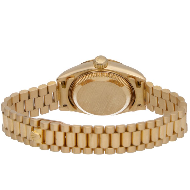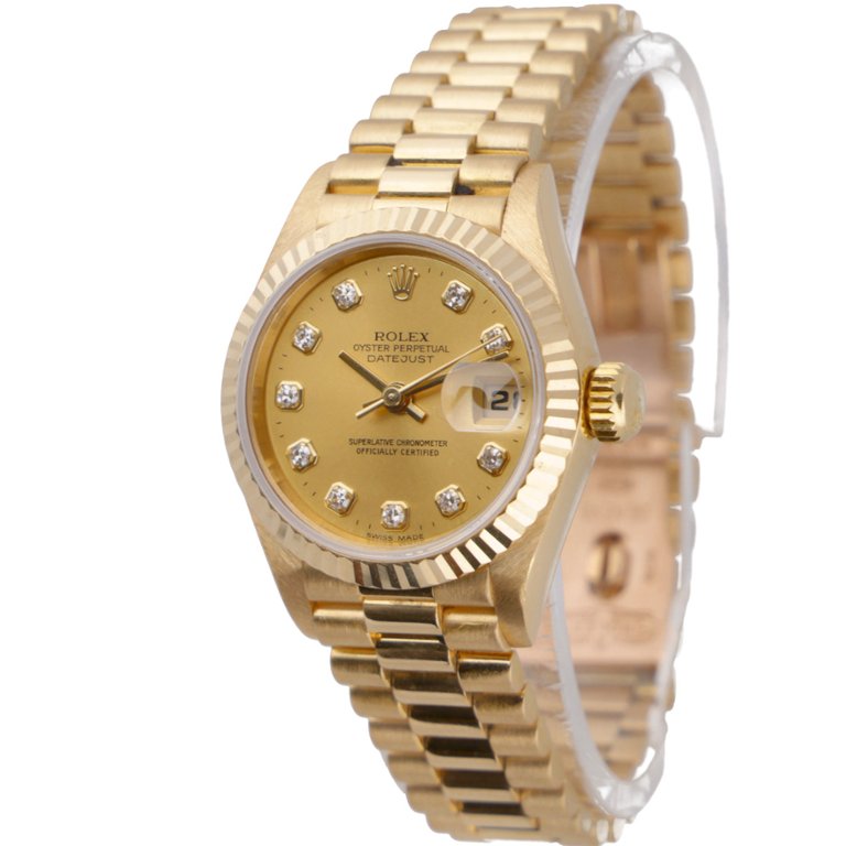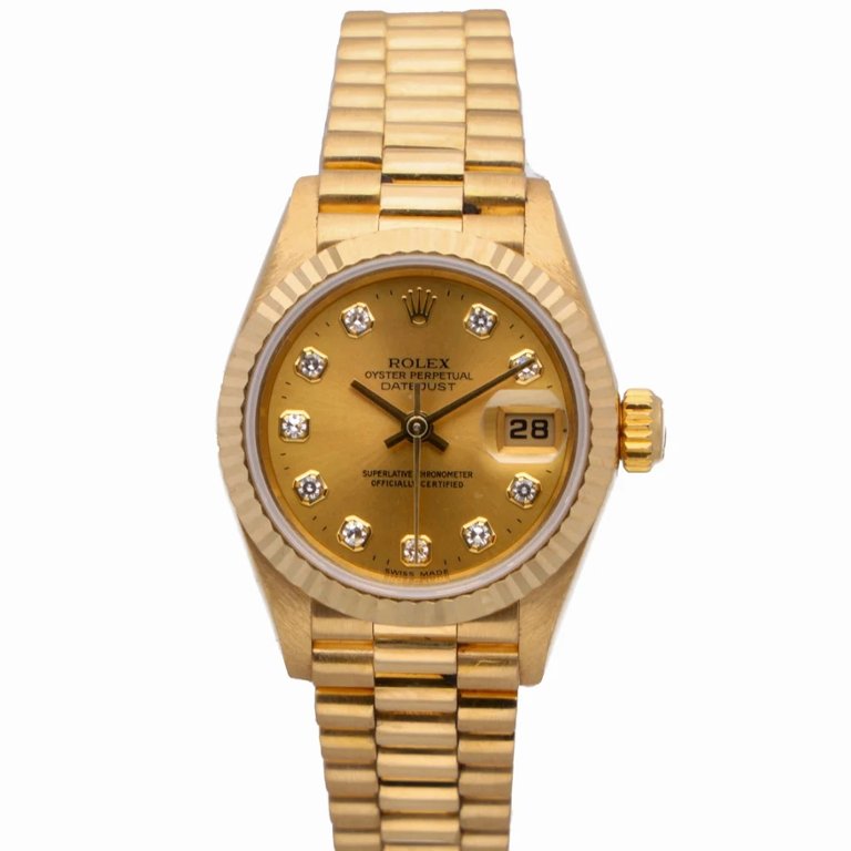 A Rolex Datejust, reference 69178, is a classic full-gold ladies’ configuration that embodies Rolex’s late-1990s design language. Produced in 1998, the 26mm case is crafted entirely from 18ct yellow gold and fitted with a fluted yellow gold bezel. The champagne dial features original Rolex diamond-set hour markers and pairs with the President bracelet, delivering a cohesive, highly recognisable aesthetic.