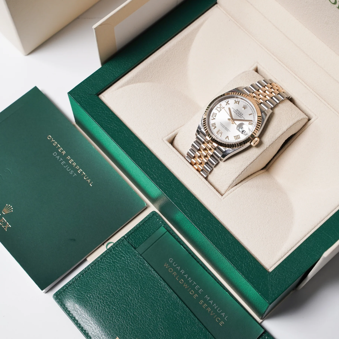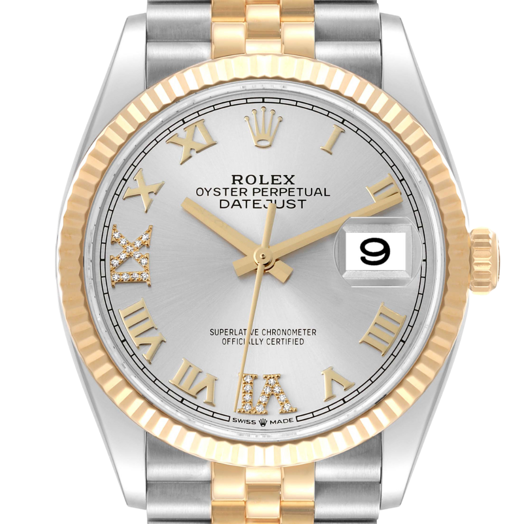 A bi-metal Rolex Datejust 36, reference 126233, combining stainless steel with 18ct yellow gold and finished with a silver dial featuring original Rolex diamond numerals at 6 and 9. This classic configuration remains one of the most sought-after Datejust variants, balancing everyday wearability with precious-metal appeal.