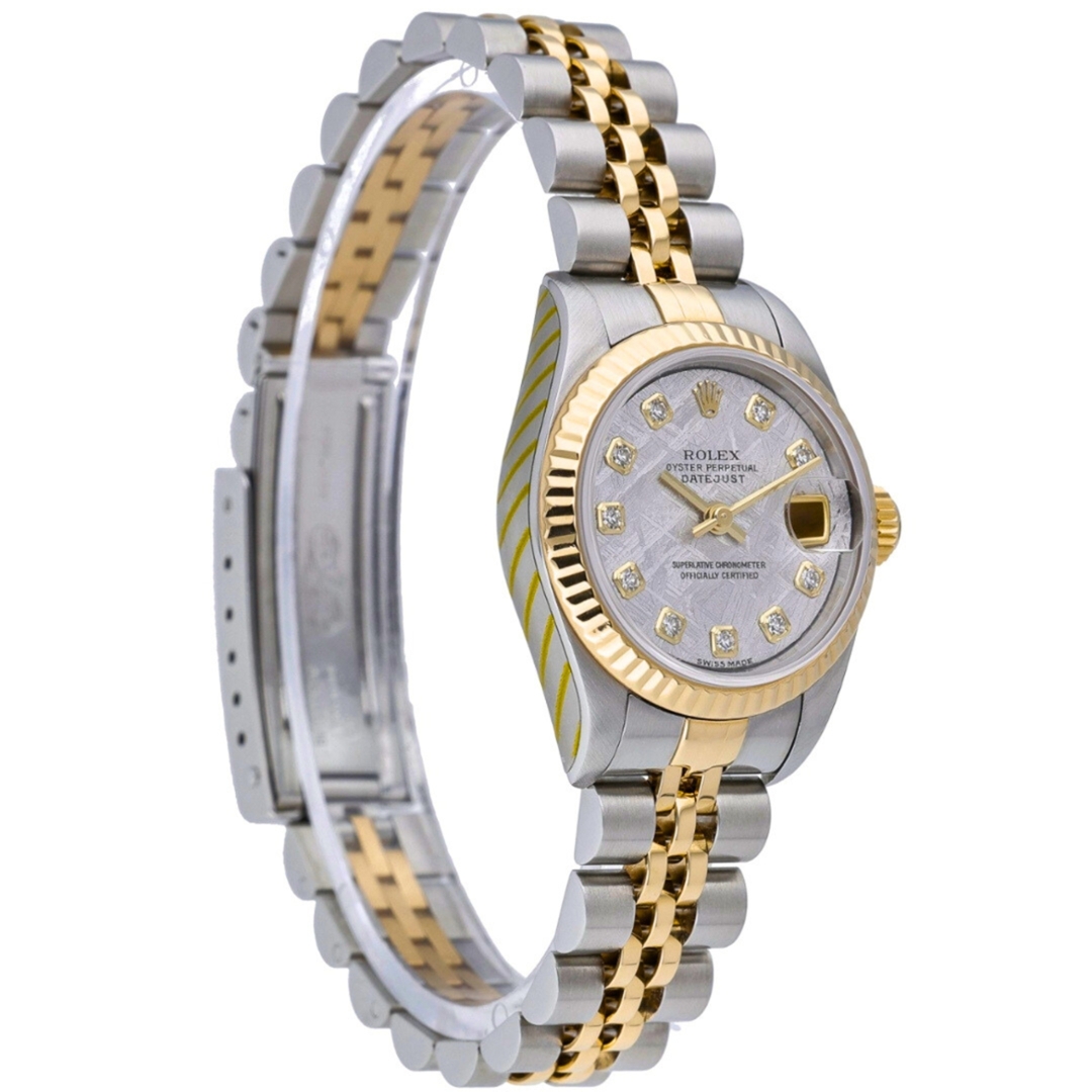 A Bi-Metal Rolex Datejust 26 Watch, crafted from stainless steel and 18ct yellow gold with a fluted bezel, presented on the iconic jubilee bracelet. This rare reference 79173 features a remarkable factory meteorite dial, beautifully complemented by original Rolex diamond hour markers. The natural patterning of the meteorite makes every example unique, ensuring no two dials are ever the same.