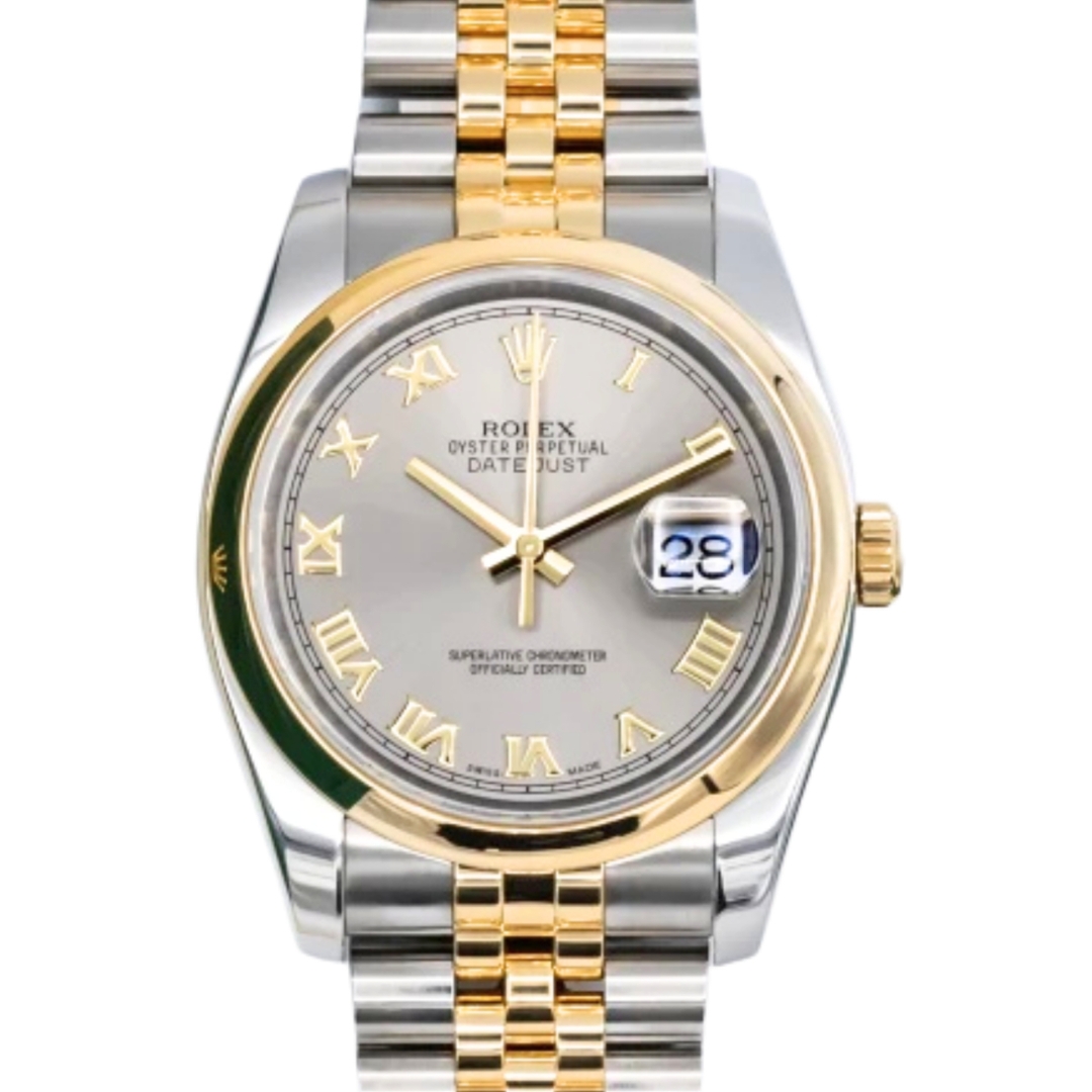 A Rolex Datejust Watch, model 116203, presented in immaculate condition. This 2004 bi-metal reference is crafted from stainless steel and solid 18ct yellow gold, featuring a 36mm Oyster case with a smooth yellow gold bezel and a silver dial set with applied yellow gold Roman numeral hour markers.