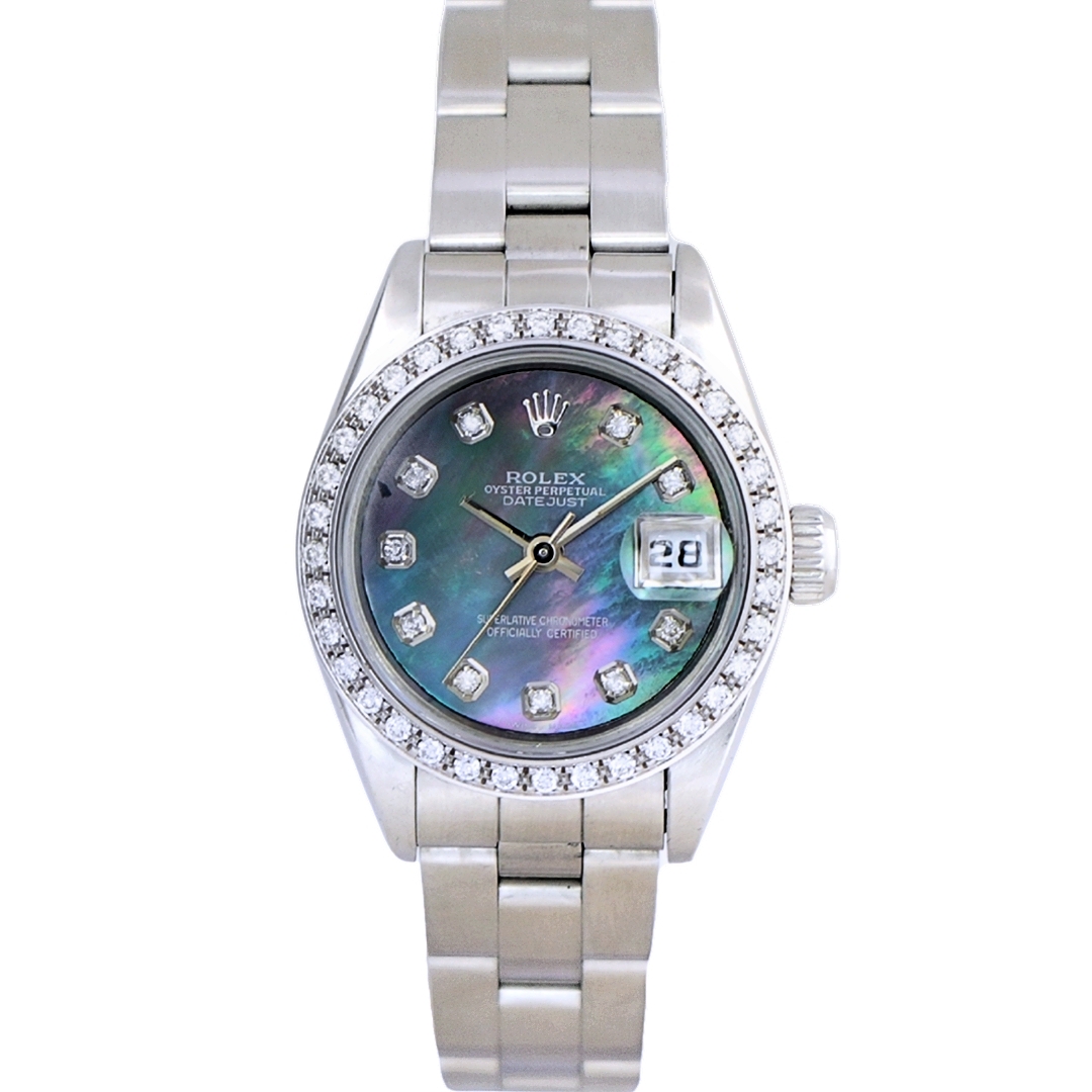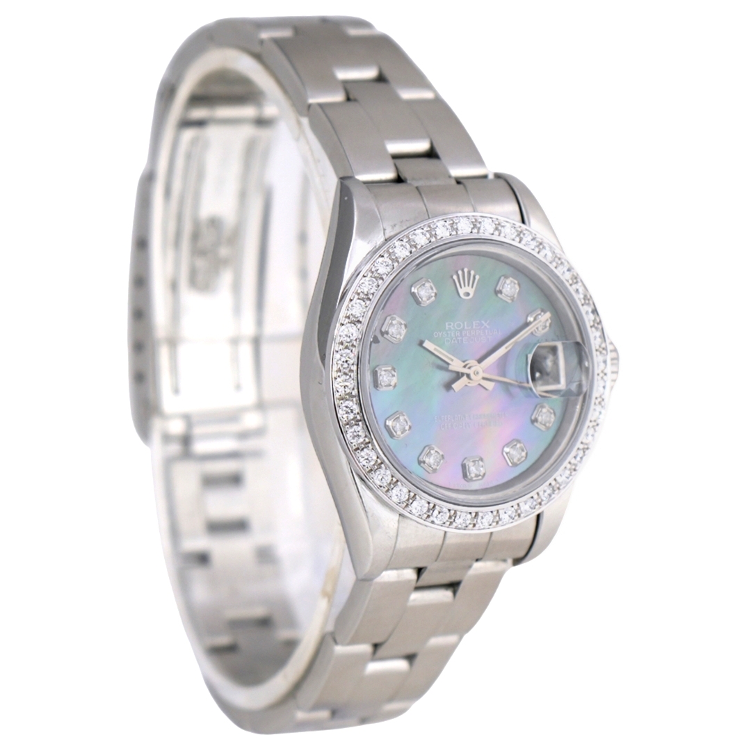 Rolex Datejust reference 69160, produced in 1998, presents a well-balanced combination of visual presence and long-term collectability. Crafted in stainless steel, it features an aftermarket diamond bezel and an aftermarket mother-of-pearl dial set with diamond numerals, giving the watch strong wrist appeal while retaining classic Datejust proportions.
