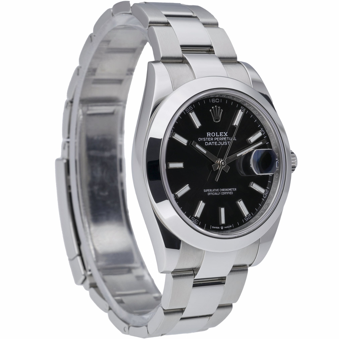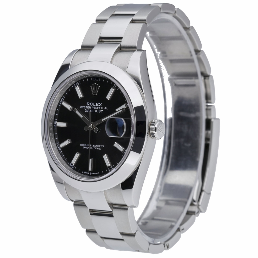 A Rolex Datejust 41 reference 126300 is presented in stainless steel with a clean black dial, offering a contemporary take on one of Rolex's most enduring designs. The smooth bezel and Oyster bracelet give the watch a purposeful, understated profile, while the 41mm case delivers modern proportions that sit confidently on the wrist.