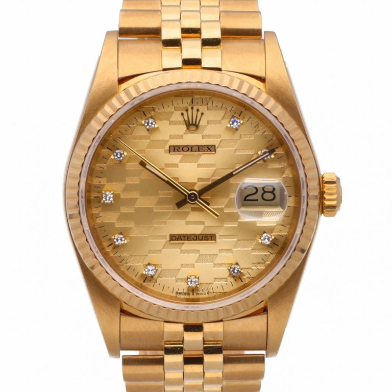 A Rolex Datejust Watch, model number 16018, is a timeless embodiment of luxury and elegance, crafted entirely from 18ct yellow gold. Released in 1986, this 36mm classic boasts a fluted bezel and a captivating champagne original diamond dial. The dial’s opulent diamonds perfectly complement the rich golden tones, creating an aura of sophistication and refinement.