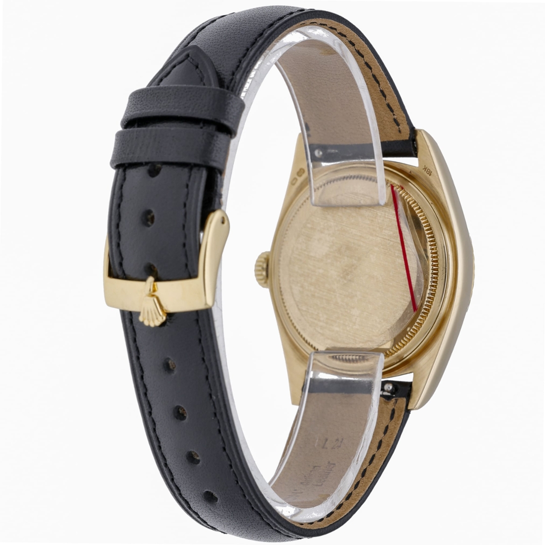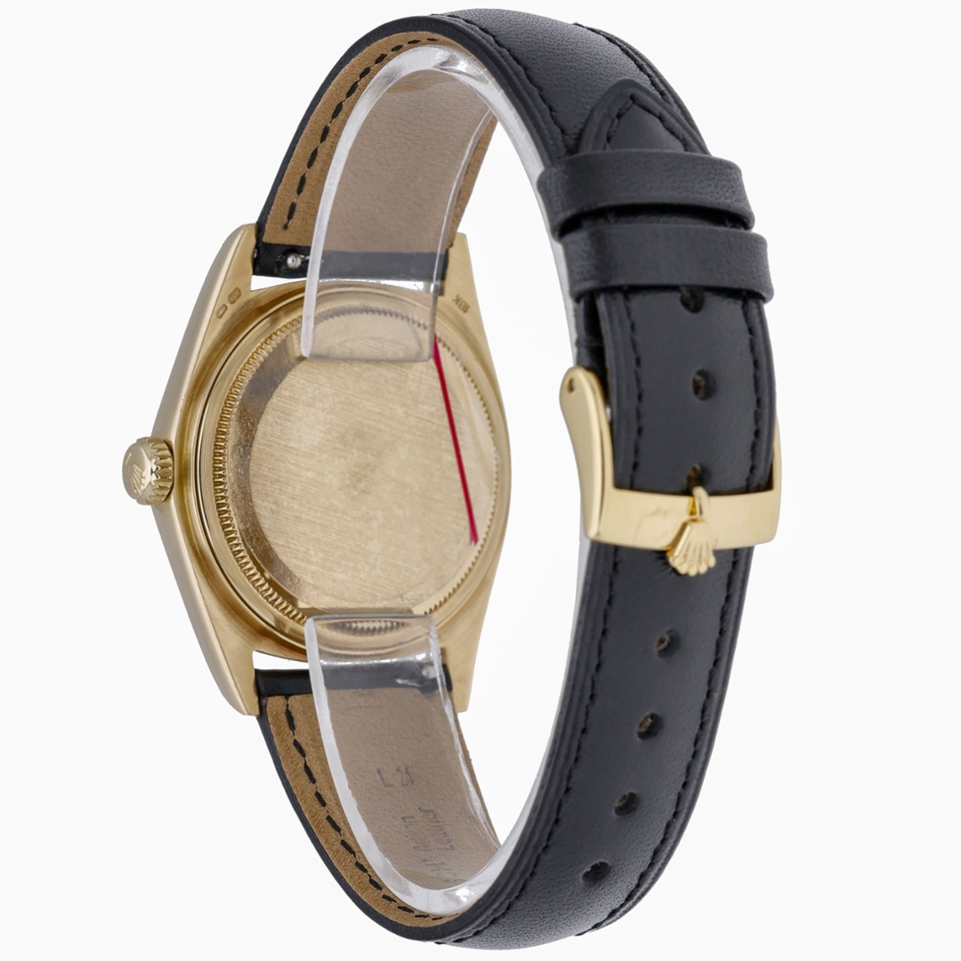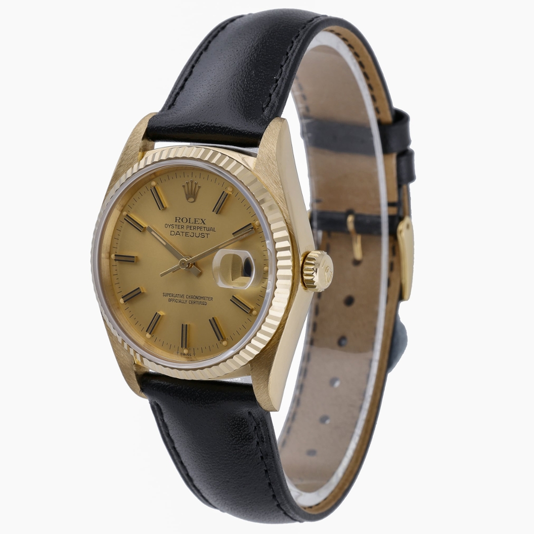 This Rolex Datejust reference 16018 features the classic 36mm Oyster case crafted entirely from 18ct yellow gold, paired with a matching yellow gold fluted bezel. The champagne dial is fitted with applied baton hour markers and gold hands, framed by an acrylic crystal with cyclops date magnification. Presented on a black leather strap, this configuration offers a more understated take on a traditionally bracelet-fitted reference.