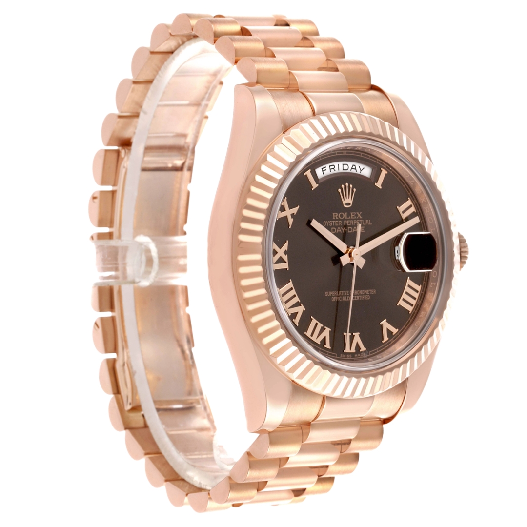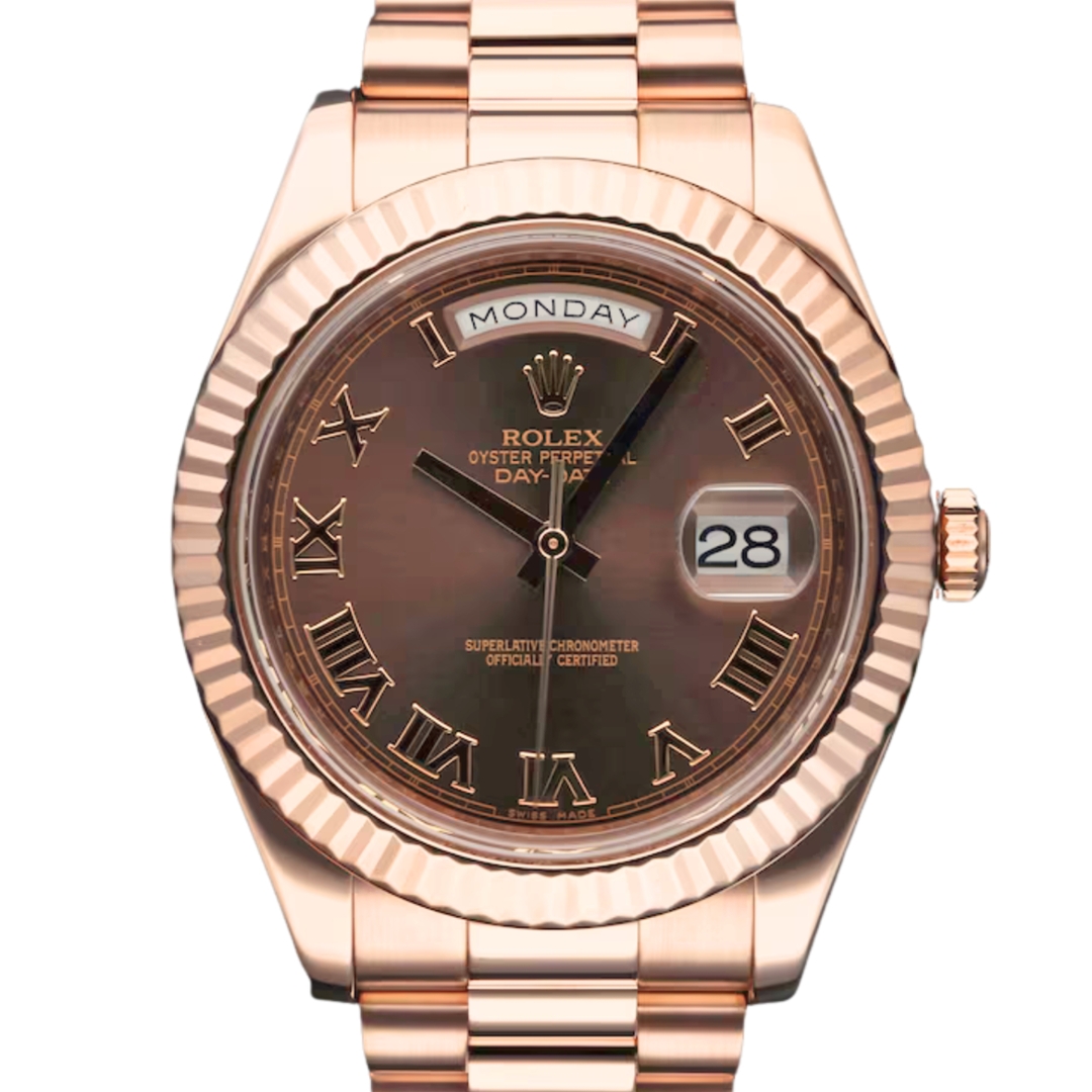 A Rolex Day-Date II, model 218235, is crafted entirely in 18ct Everose gold, delivering exceptional presence and unmistakable luxury. The 41mm case is paired with the iconic President bracelet and fluted bezel, creating a design that is both powerful and refined. The chocolate dial adds depth and warmth, enhanced by applied Roman numerals and the classic day and date displays, offering a rich and highly distinctive aesthetic.