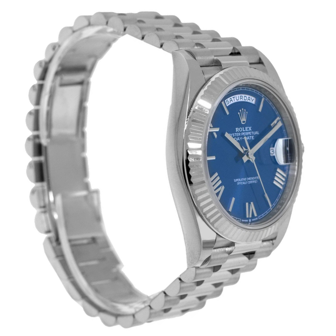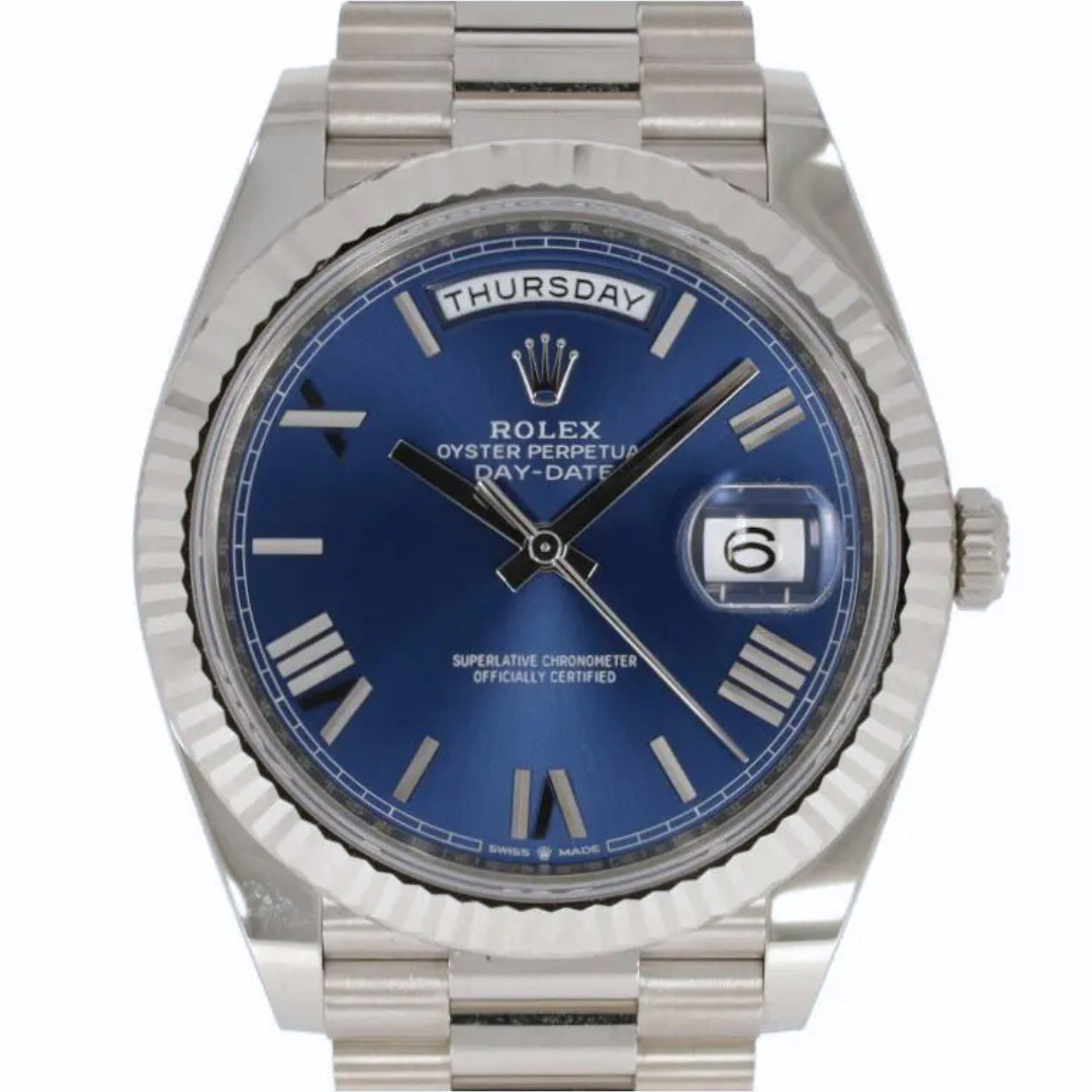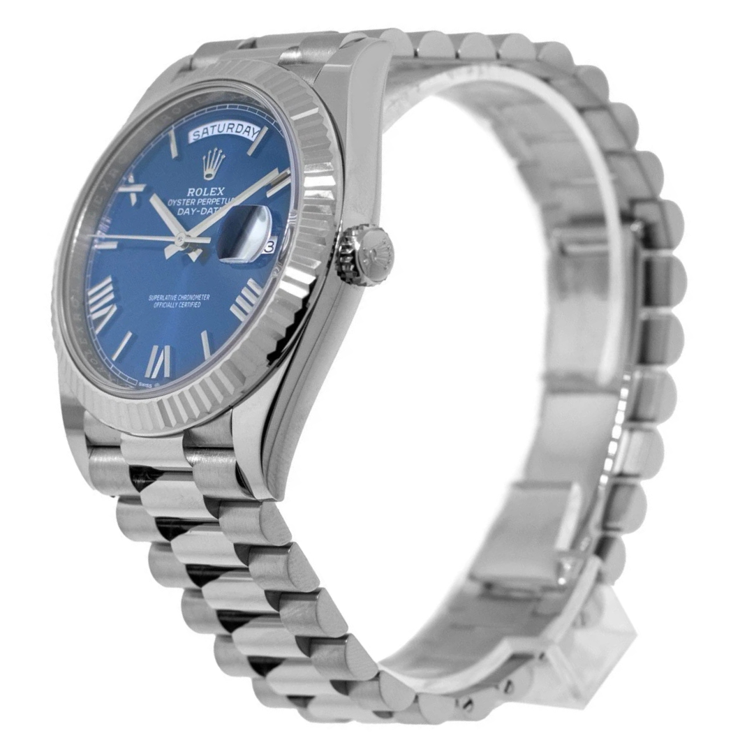This Rolex Day-Date 40 reference 228239 is crafted entirely from 18ct white gold, giving it a strikingly refined presence while maintaining the unmistakable weight and luxury of a flagship Rolex model. The blue dial adds real depth and richness, shifting beautifully in the light and pairing perfectly with the sharp Roman numeral indices and the legendary Day-Date display. The fluted white-gold bezel elevates the watch further, catching light with every movement and reinforcing why the 228239 is one of the most sought-after configurations in the modern Day-Date lineup.