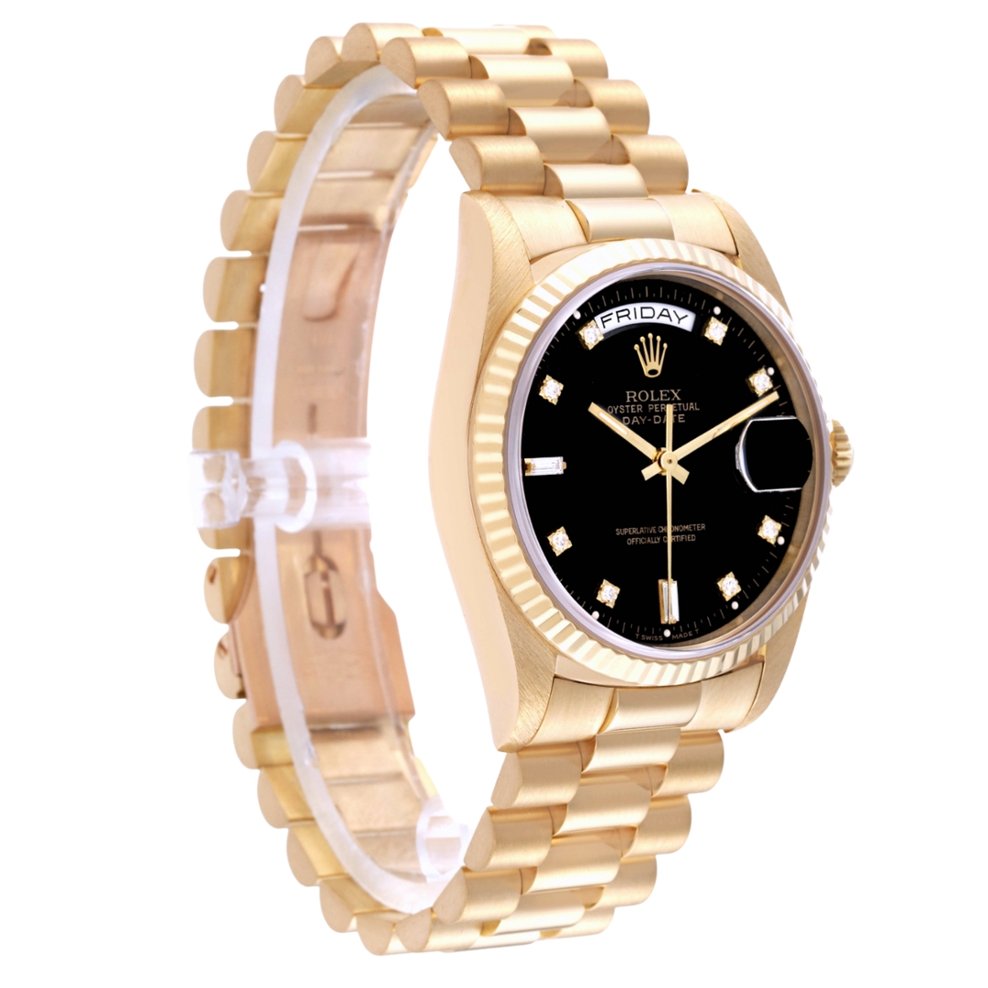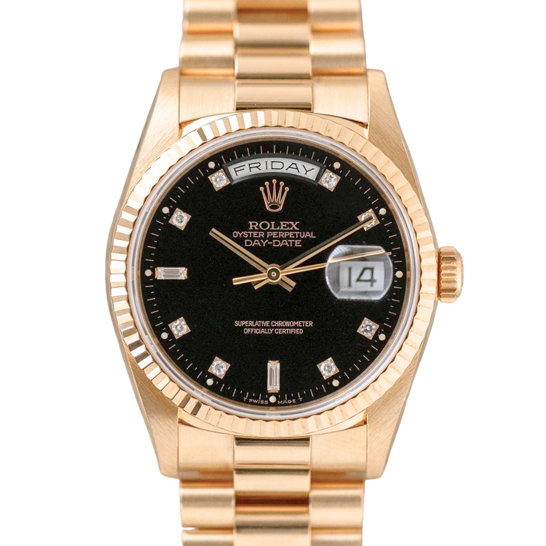 A Rolex Day-Date Watch, Full 18ct Yellow Gold with a Yellow Gold Fluted Bezel and a Black Dial with Original Rolex Diamond Numerals.