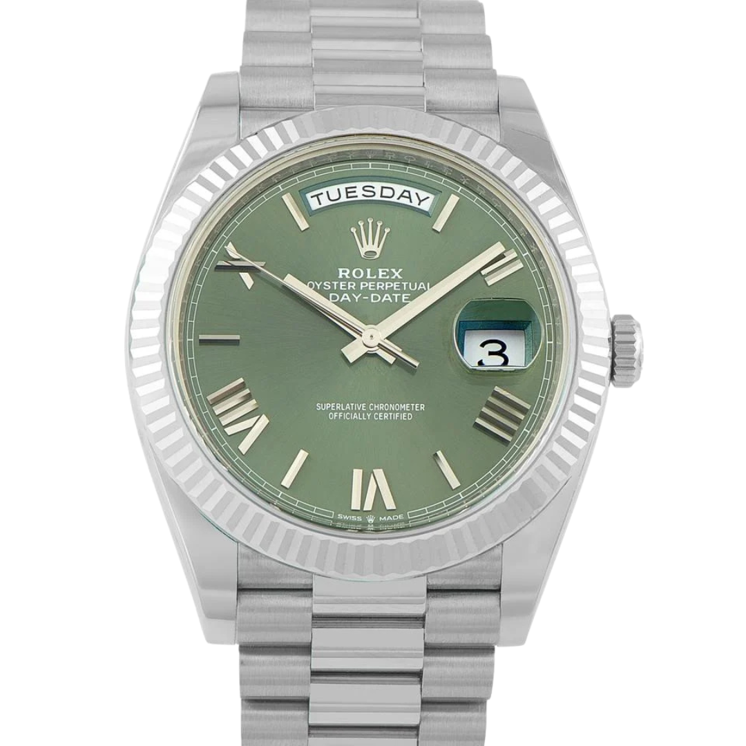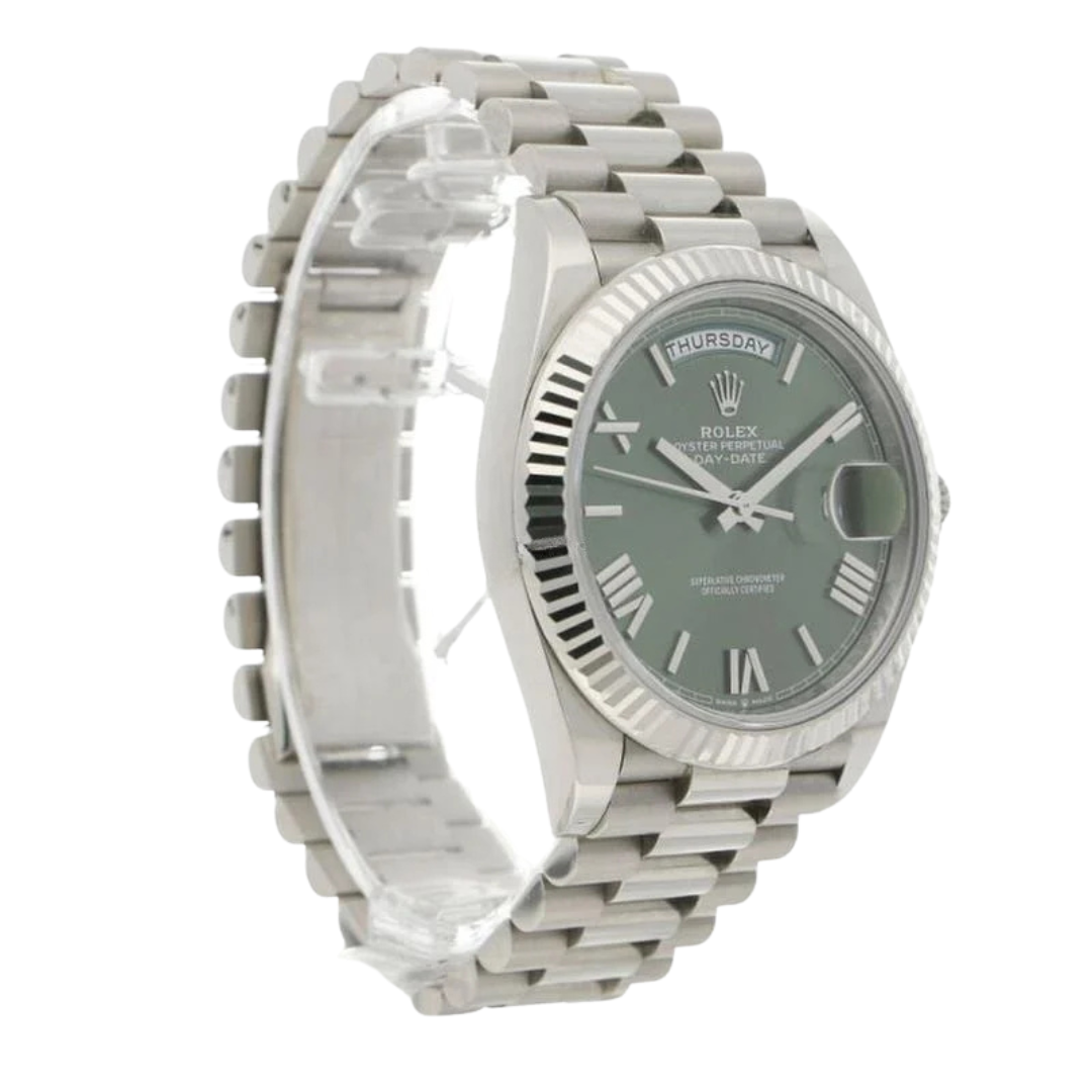 A Rolex Day-Date watch crafted in full 18ct white gold, reference 228239, featuring the iconic white gold fluted bezel and a highly desirable olive green dial. Produced in 2021, this 40mm Day-Date pairs unmistakable presence with refined proportions, sitting confidently on the wrist via the solid President bracelet.