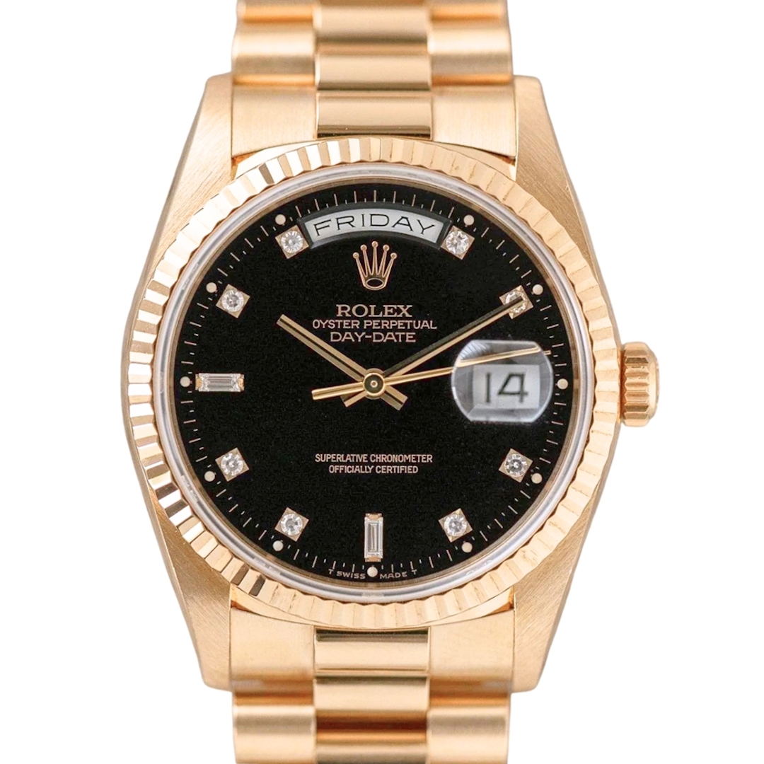 A Rolex Day-Date Watch, Full 18ct Yellow Gold with a Yellow Gold Fluted Bezel and a Black Dial with Original Rolex Diamond Numerals.
