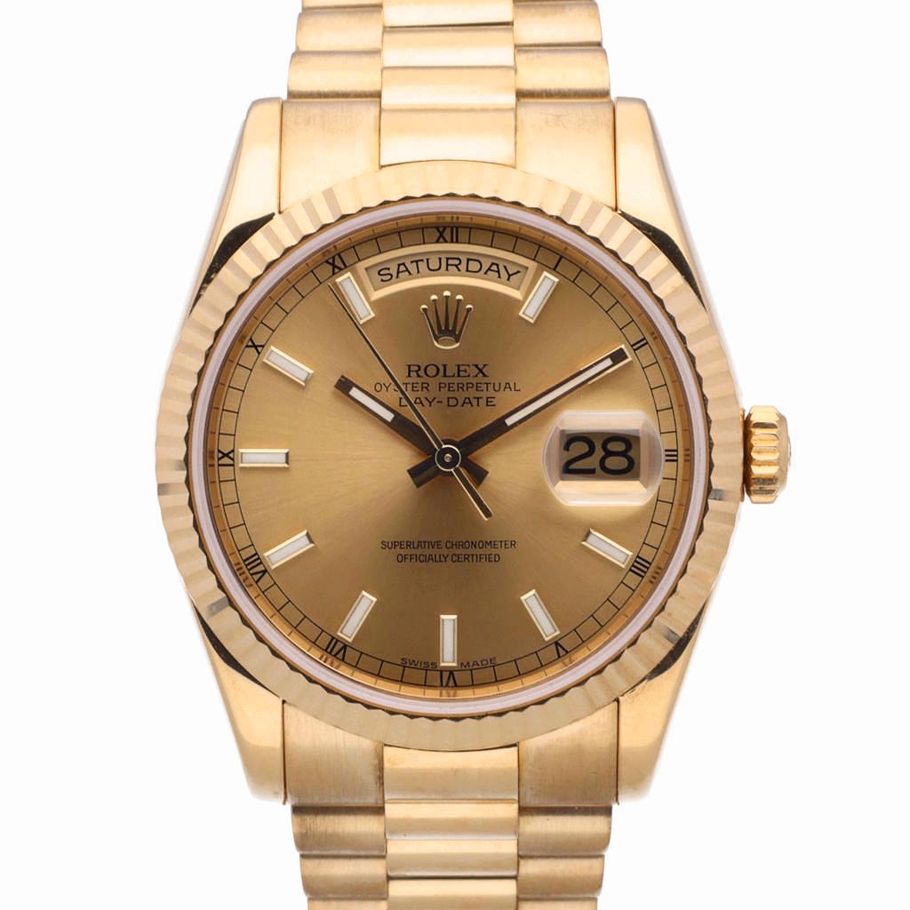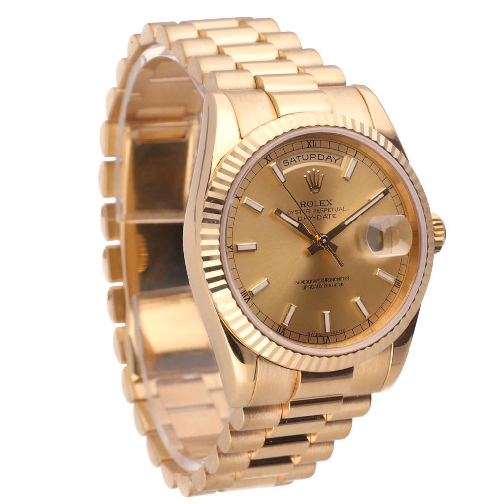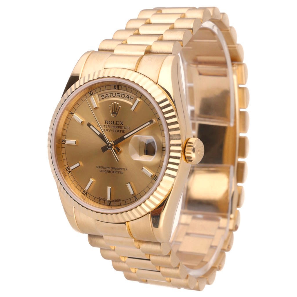 A Rolex Day-Date 118238 in full 18ct yellow gold, fitted with the iconic President bracelet and a matching fluted bezel. This 36mm example features a classic gold dial with applied baton hour markers, paired with the signature day display at 12 o’clock and date aperture at 3, delivering the unmistakable Day-Date identity.