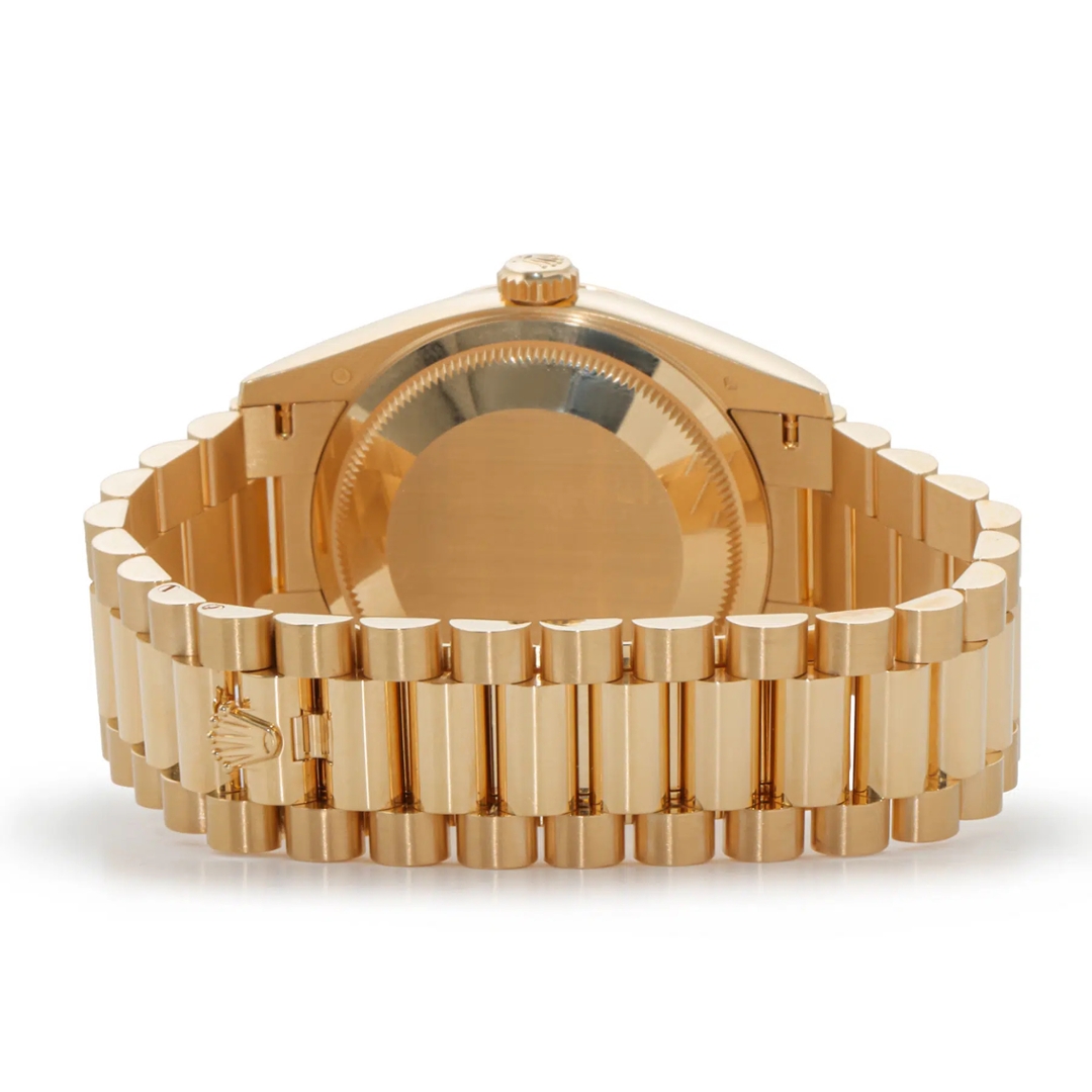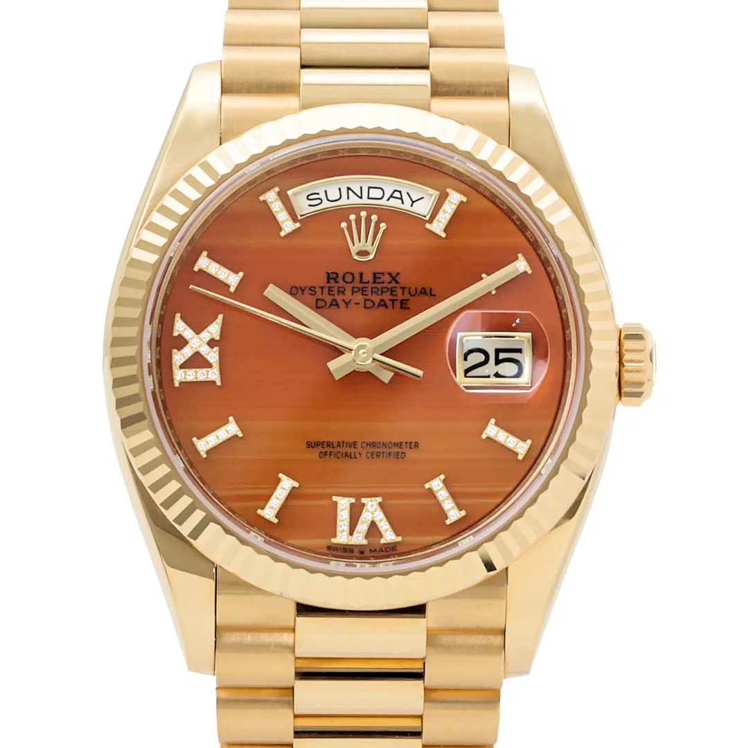 A Rolex Day-Date reference 128238 is a distinguished expression of Rolex’s most prestigious collection, crafted entirely from solid 18ct yellow gold. The 36mm case is paired with a classic fluted bezel and the iconic President bracelet, delivering unmistakable presence and balance. The carnelian dial, set with original Rolex diamond Roman numerals, adds rare depth and individuality.