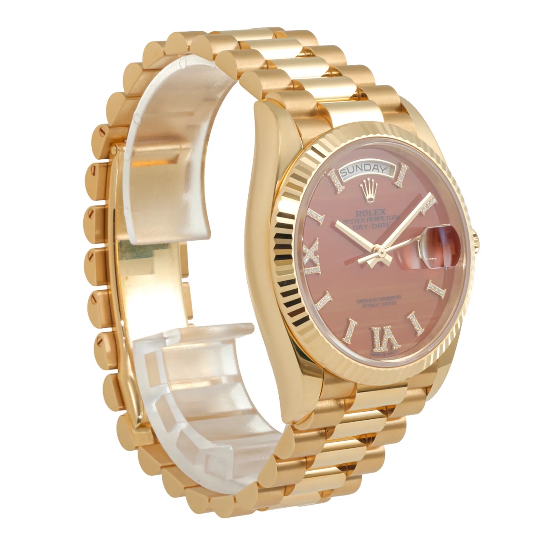 A Rolex Day-Date Watch, Full 18ct Yellow Gold with a Fluted Bezel with a Carnelian Dial with Original Rolex Diamond Numerals on a Presidential Bracelet.