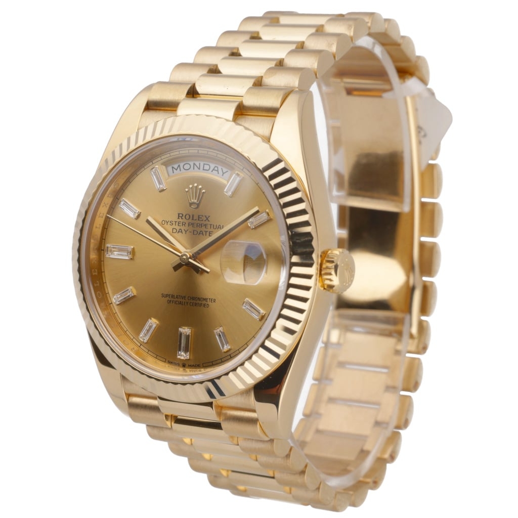 The dial is a champagne sunburst finish, perfectly complementing the yellow gold case, and set with original factory diamond baguette hour markers. The warm monochromatic aesthetic reinforces the Day-Date’s status as Rolex’s flagship precious-metal model. The day aperture at 12 and the date window at 3 maintain the collection’s instantly recognisable layout. Powering the watch is the Rolex Calibre 3255 automatic movement, featuring Chronergy escapement technology and Superlative Chronometer certification for exceptional precision and performance.