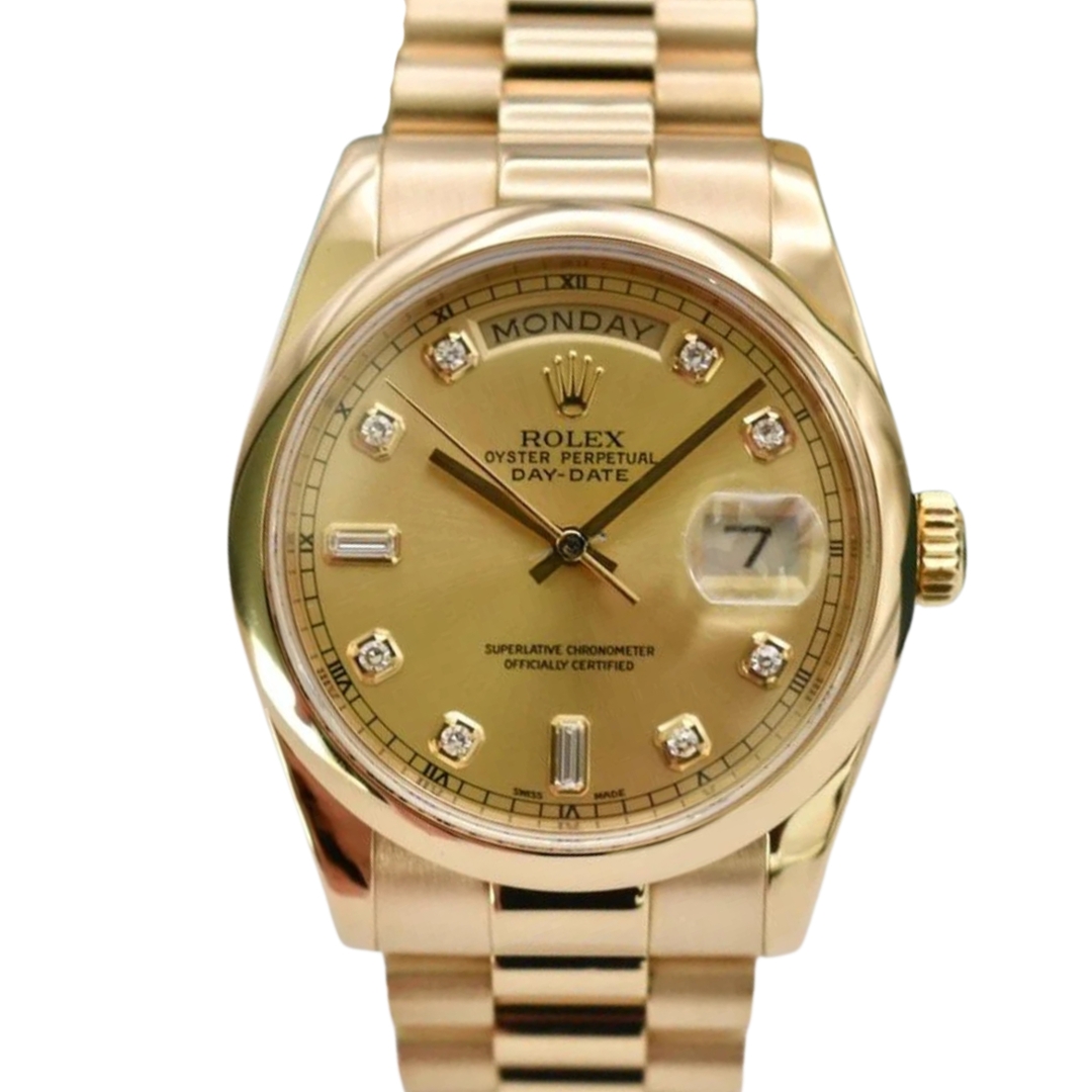 A Rolex Day-Date Watch, Full 18ct Yellow Gold with a Champagne Dial with Diamond Numerals.