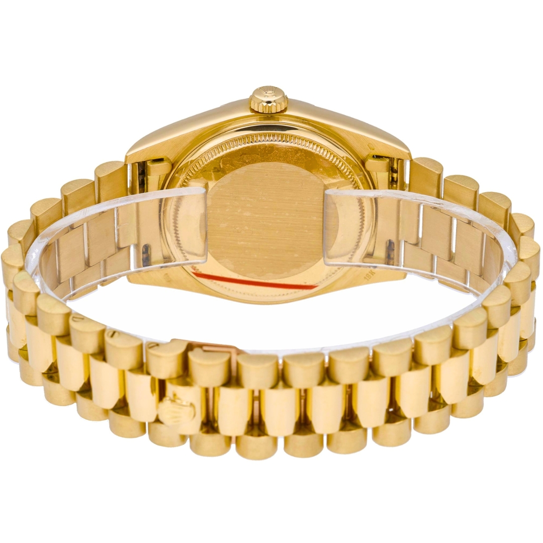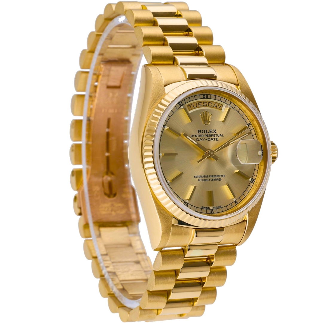Adorned with a champagne dial, the Day-Date 18038 radiates warmth and sophistication, beautifully complementing its golden exterior. The dial features the iconic day-date display at the 12 o'clock and 3 o'clock positions, enhancing both functionality and aesthetic appeal.