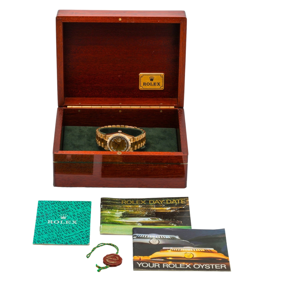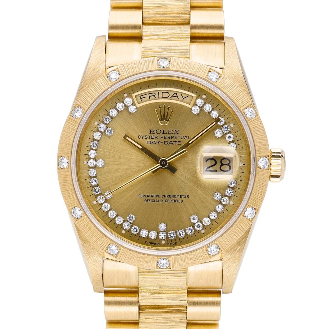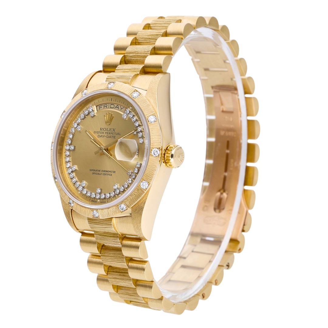 A Rolex Day-Date, model 18108, presented in full 18ct yellow gold, showcasing a bold and highly individual configuration. The 36mm case features the distinctive bark-textured finish across the bezel and matching Presidential bracelet, enhancing its vintage character and tactile appeal. This example is further elevated with an afterset diamond bezel, complementing the champagne dial, which has been customised with diamond hour markers and scattered diamonds throughout, creating a striking and unmistakable aesthetic. The classic day aperture at 12 o’clock and date display at 3 o’clock retain the iconic Day-Date functionality.