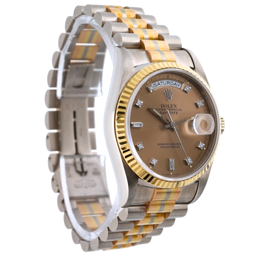 A Rolex Day-Date reference 18239 is crafted in 18ct white gold and paired with the highly distinctive Tridor President bracelet, combining 18ct white, yellow, and rose gold. The fluted 18ct yellow gold bezel frames a rich champagne brown dial, set with original factory Rolex diamond hour markers and the iconic day and date apertures.