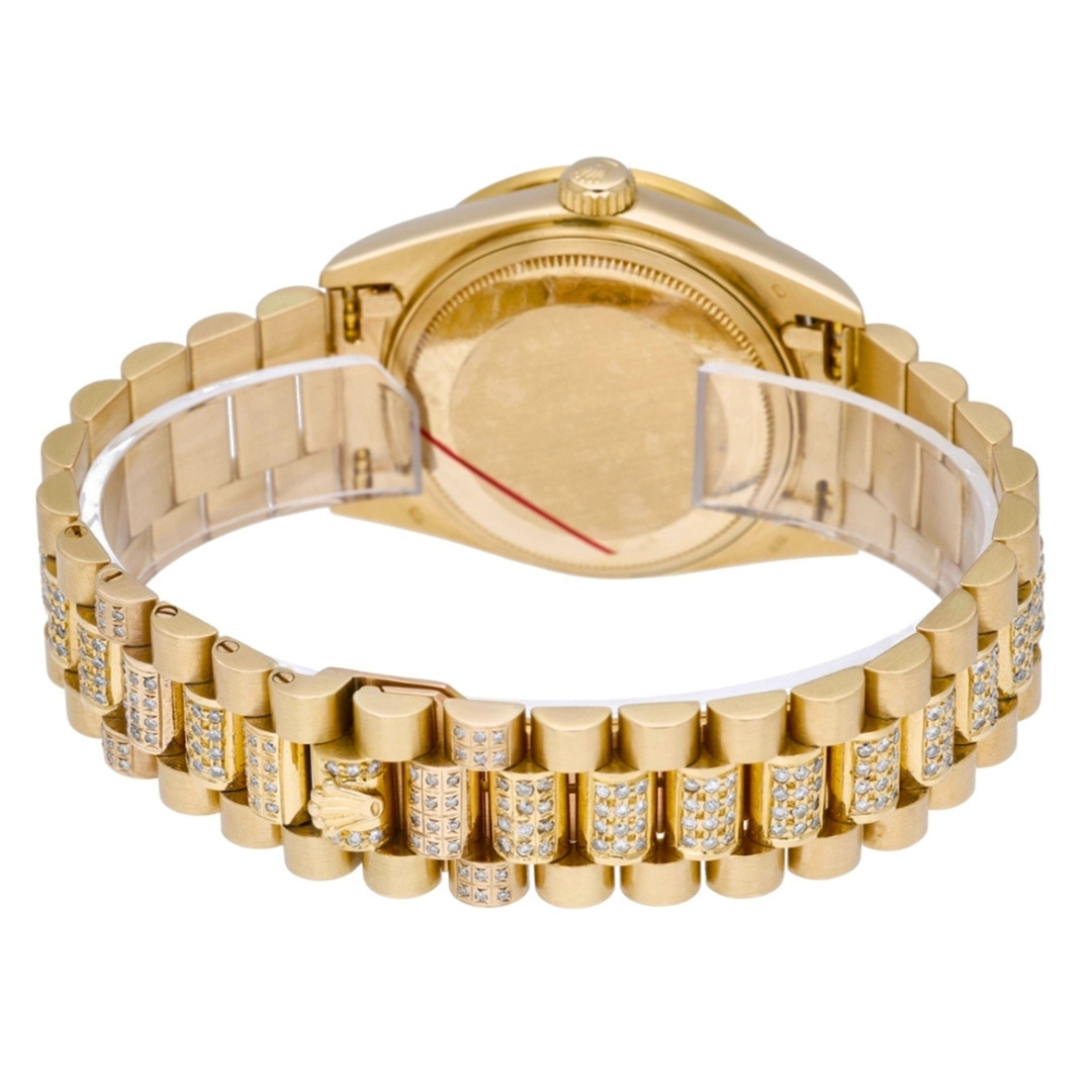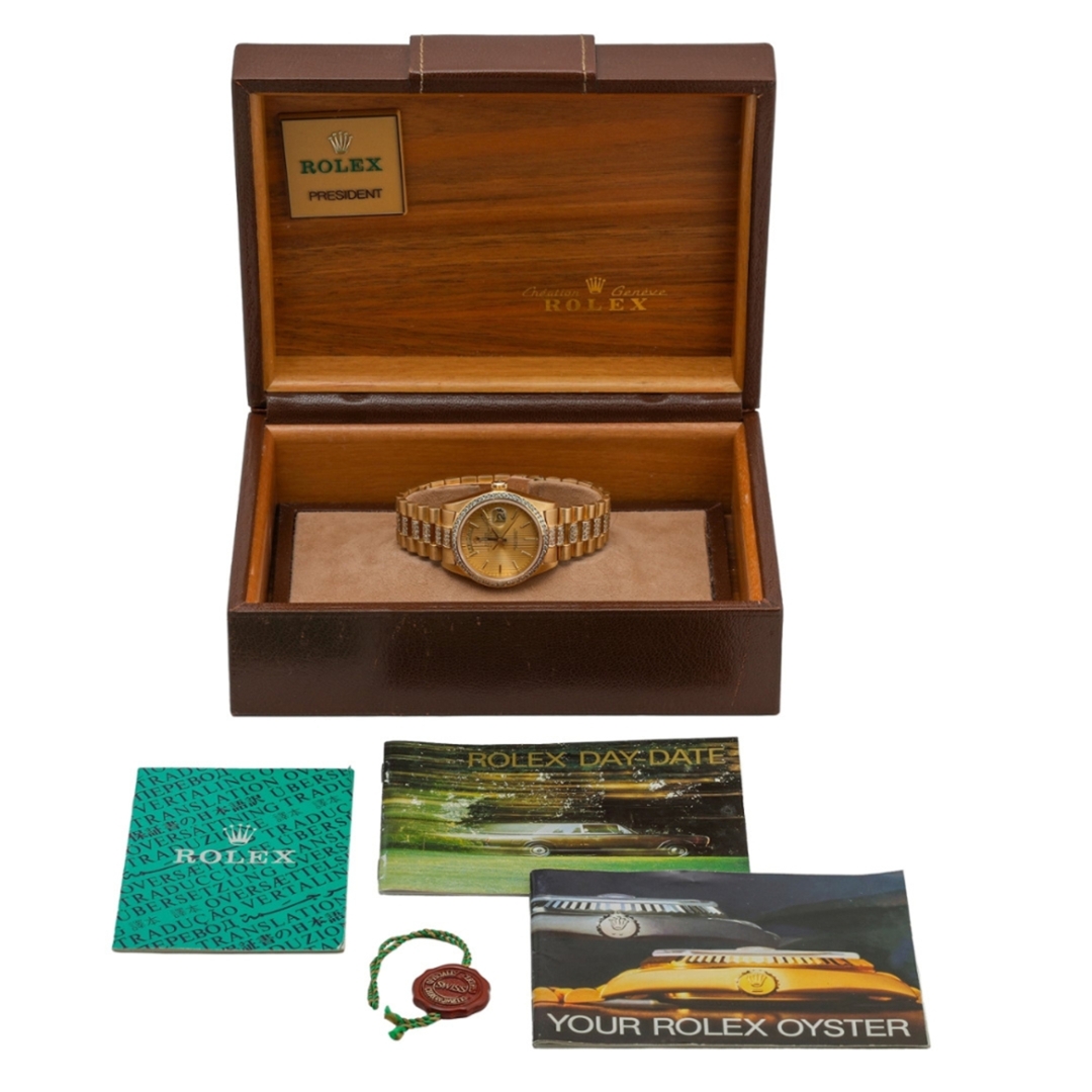 A Rolex Day-Date in full 18ct yellow gold, presented with a striking striped champagne dial and enhanced by an aftermarket diamond-set bezel and bracelet. This iconic configuration marks the evolution of the Day-Date into the sapphire-crystal era, while retaining the classic 36mm proportions and unmistakable presence that have defined the model for decades.
