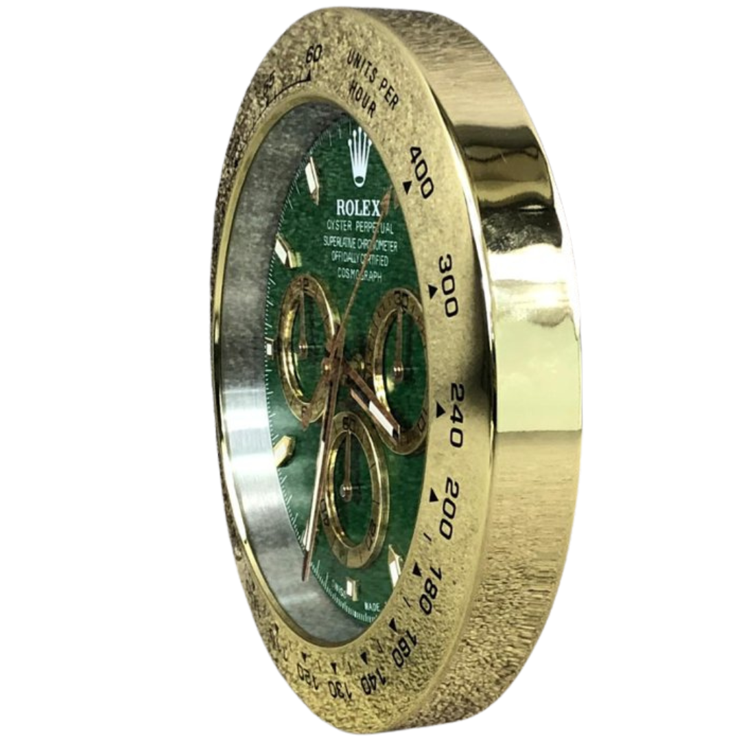 A stainless steel replica Rolex Daytona wall clock, presented with a rich green dial and striking gold-tone bezel that delivers a bold and contemporary take on this iconic chronograph design. The vibrant green face is complemented by gold accents across the hands, hour markers, and sub-dial surrounds, creating a standout aesthetic that immediately captures attention while maintaining the unmistakable Daytona identity.