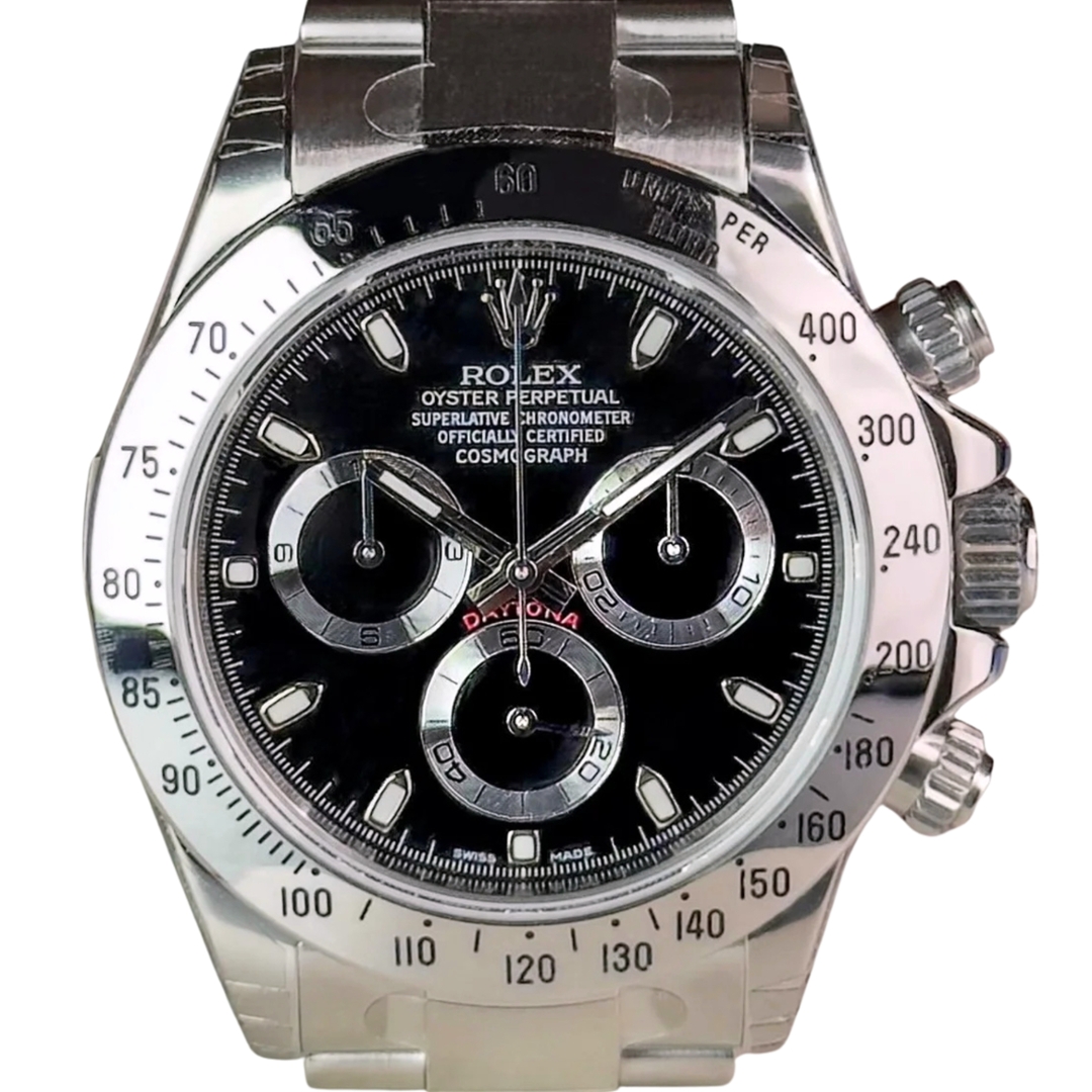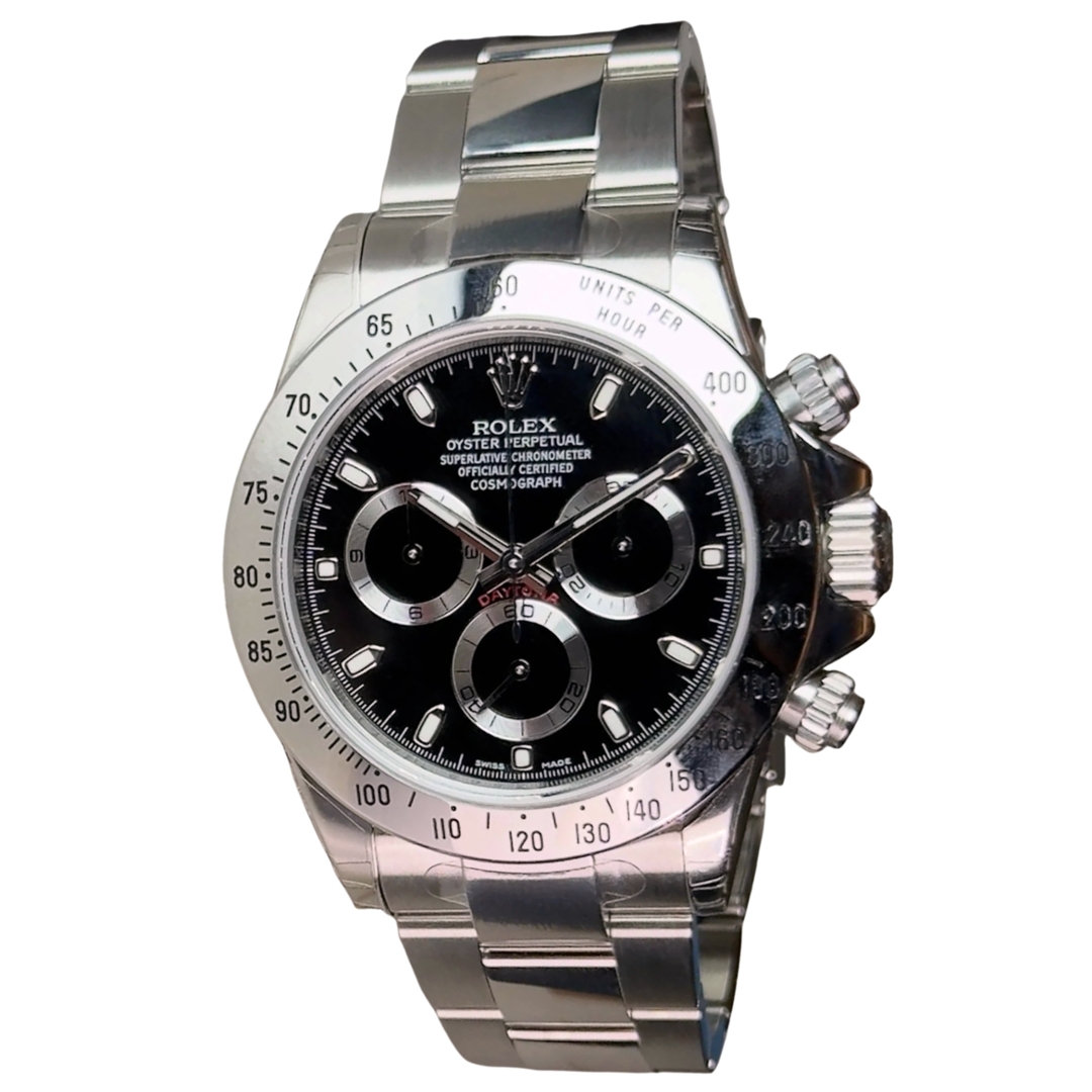 A Rolex Daytona Watch that stands firmly among the most sought-after modern collectables, this stainless steel 116520 from 2010 represents one of the final eras of the classic steel-bezel Daytona — a reference whose desirability has only intensified since production ceased. With its black dial and unmistakable tri-register layout, it sits squarely in the lineage of Daytona models that have become cornerstones of serious collections worldwide. Nothing in the image contradicts the details provided in your listing.