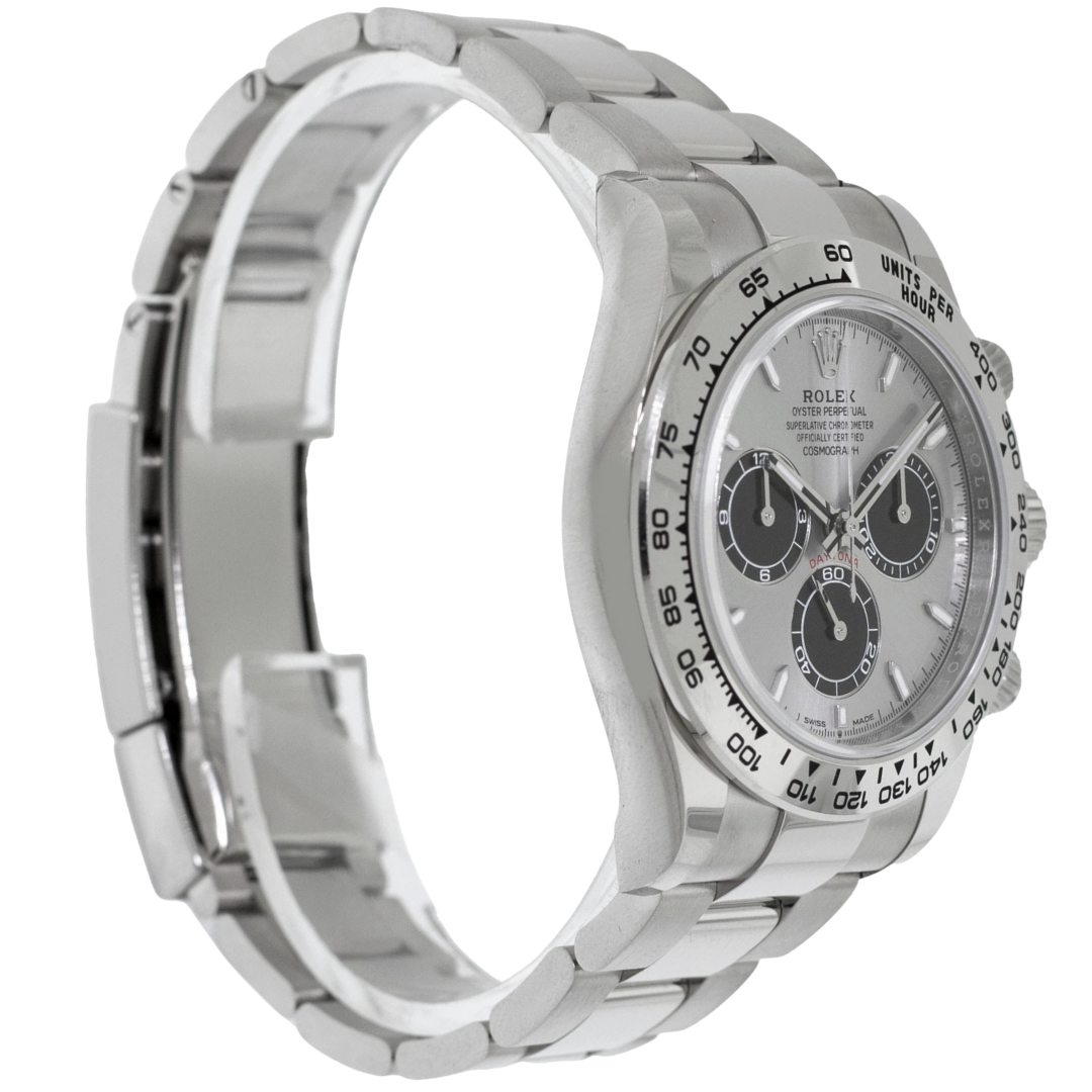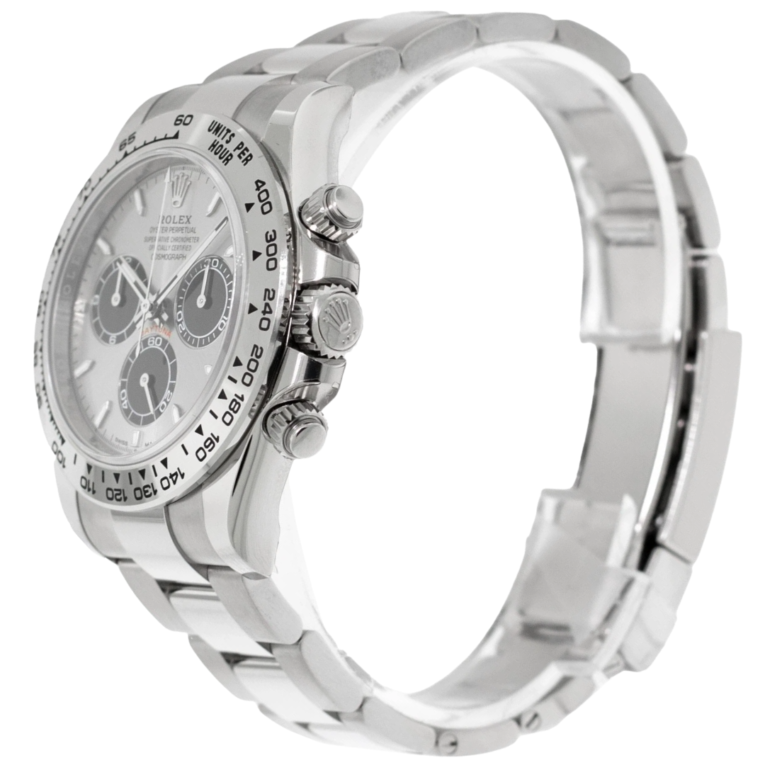 Powered by Rolex’s latest-generation Calibre 4131 automatic movement, this Daytona delivers outstanding chronometric accuracy, a refined finish, and a power reserve of approximately 72 hours. Every component of this timepiece has been meticulously engineered to meet the highest standards of durability and precision, from its solid white gold Oyster bracelet to the robust clasp that secures it with effortless comfort.