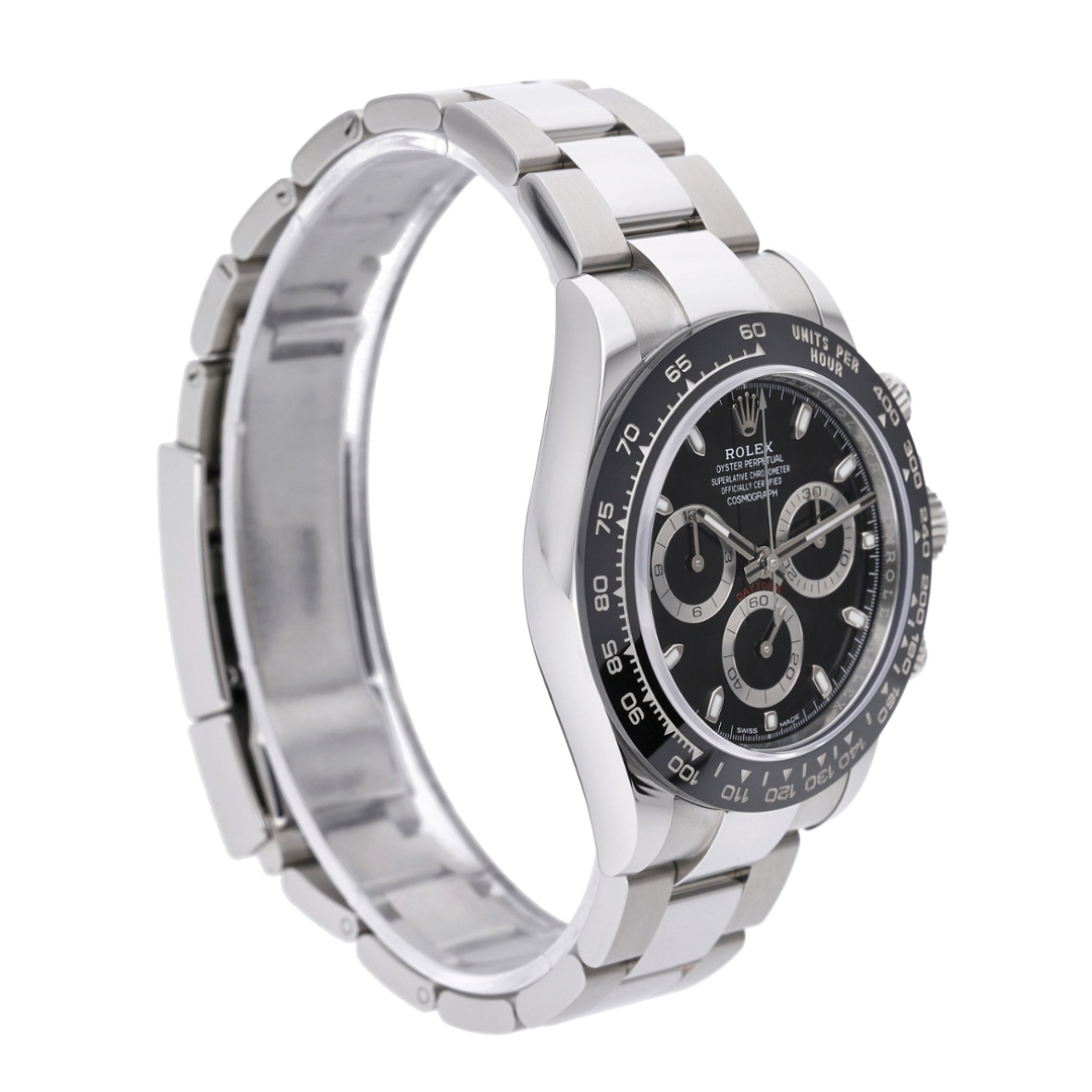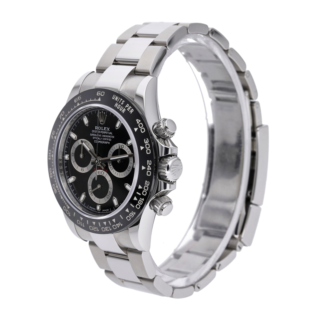 A Rolex Daytona Watch, Stainless Steel with a Black Bezel and Dial.