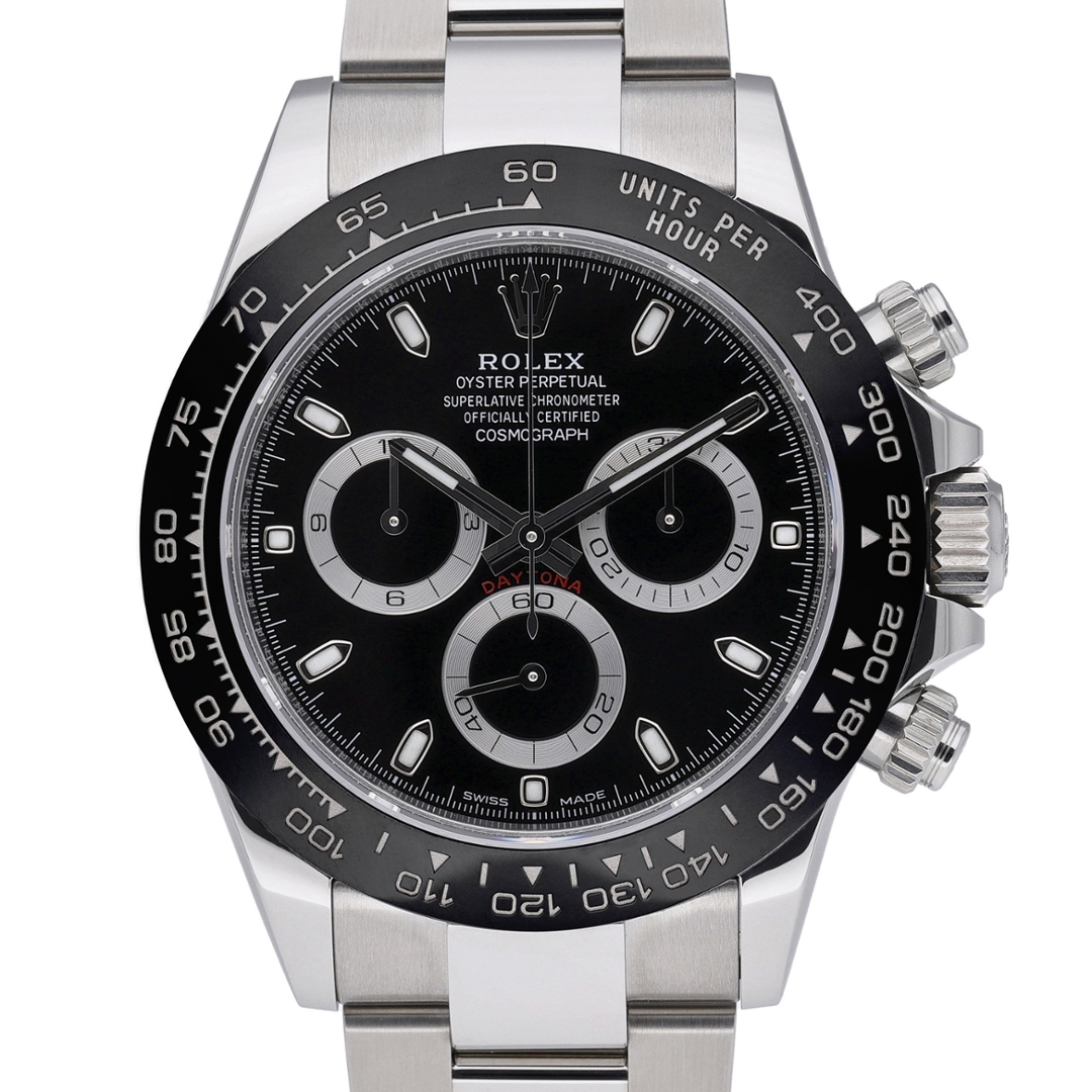 A Rolex Cosmograph Daytona 116500LN, crafted in stainless steel with the black Cerachrom bezel and black dial. First introduced in 2016, this reference has become one of the most highly sought-after modern Rolex watches, with waiting lists that have stretched for years and secondary market values consistently exceeding retail prices.