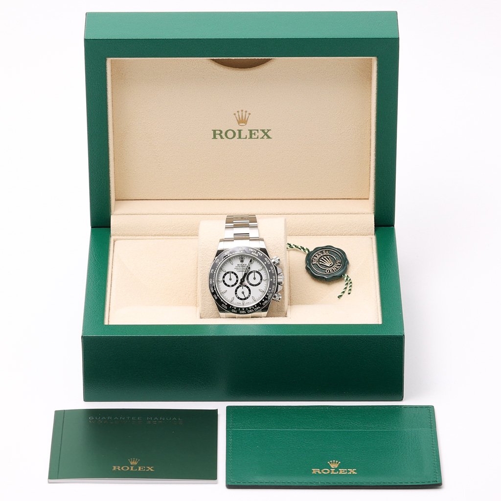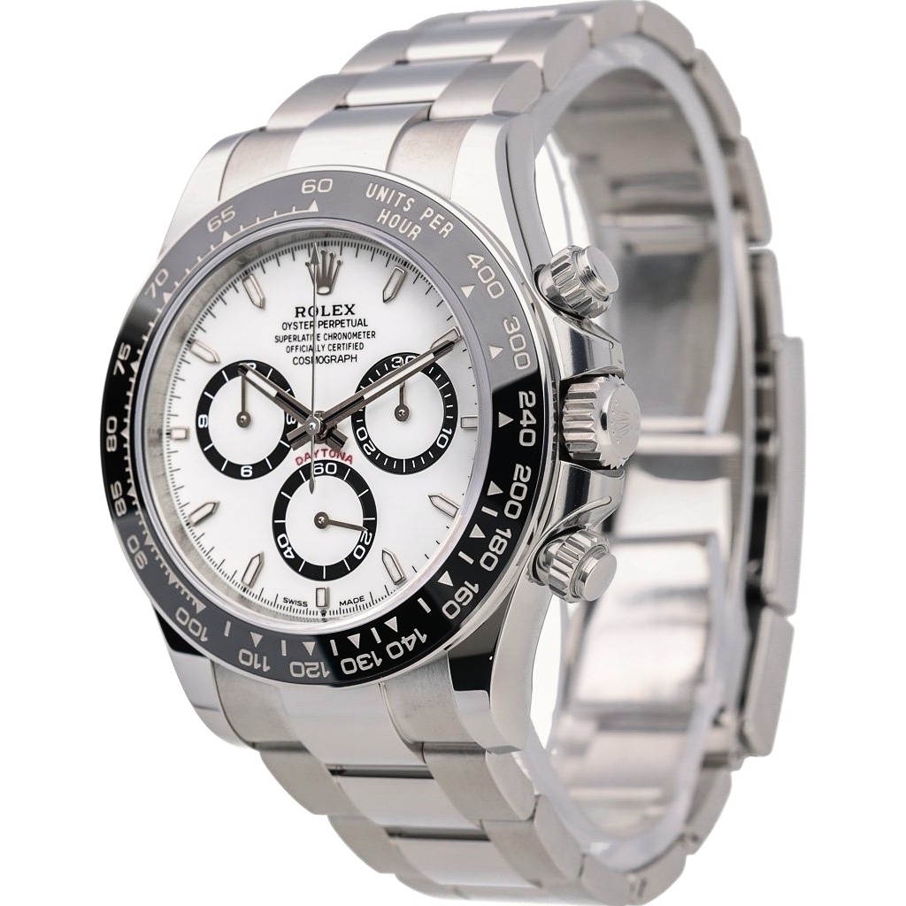 A Rolex Daytona 126500LN, a 2023 model, embodies the pinnacle of luxury and precision in the watchmaking industry. This exquisite timepiece features a robust 40mm stainless steel case, strikingly complemented by a sleek black bezel. The white dial offers a clean, sophisticated contrast, enhancing its legibility and timeless appeal.