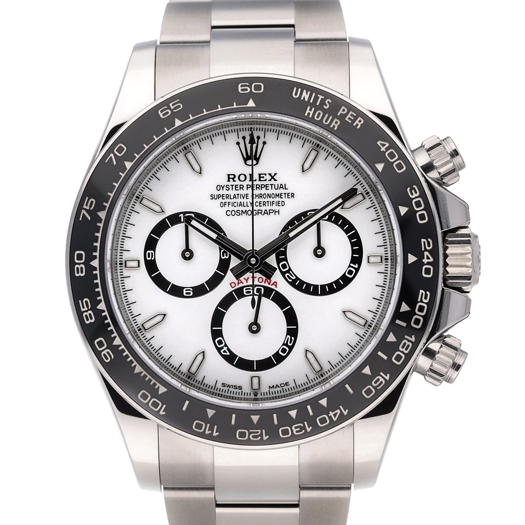 A Rolex Daytona Watch, Stainless Steel with a Black Bezel and a White Dial.