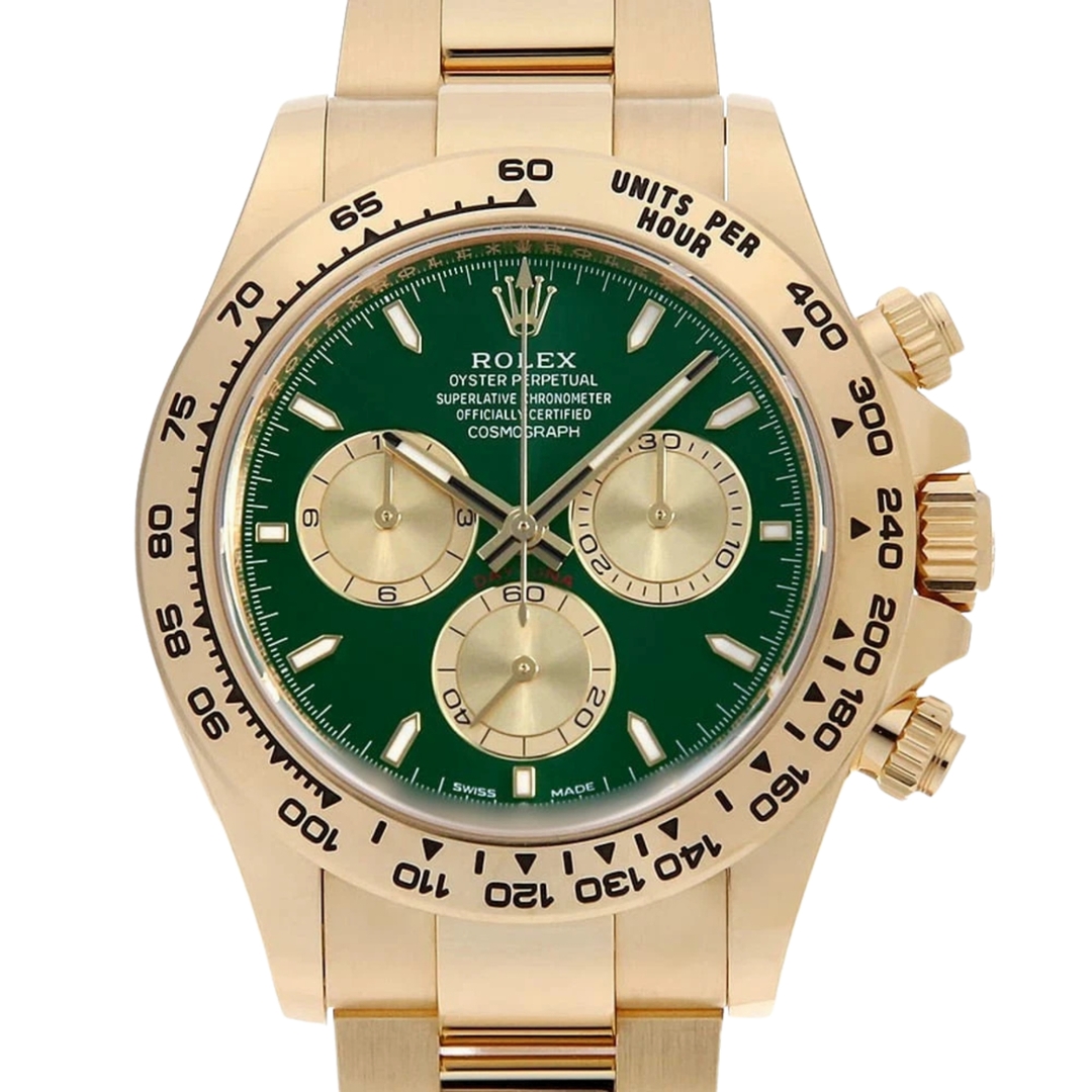 A Rolex Cosmograph Daytona 126508 in full 18ct yellow gold, featuring a striking green dial, is one of the most coveted modern references, blending prestige, exclusivity, and investment appeal. Nicknamed the “John Mayer Daytona” after the musician famously highlighted its beauty, this watch has become an icon in its own right, commanding strong attention from collectors worldwide. The vibrant green dial contrasts magnificently with the warm tones of the yellow gold case and bracelet, while the gold sub-dials provide perfect balance and legibility.