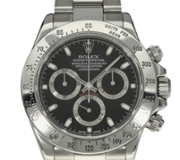 A Rolex Daytona Watch, Stainless Steel with a Black Bezel and Dial.