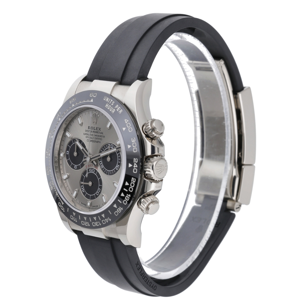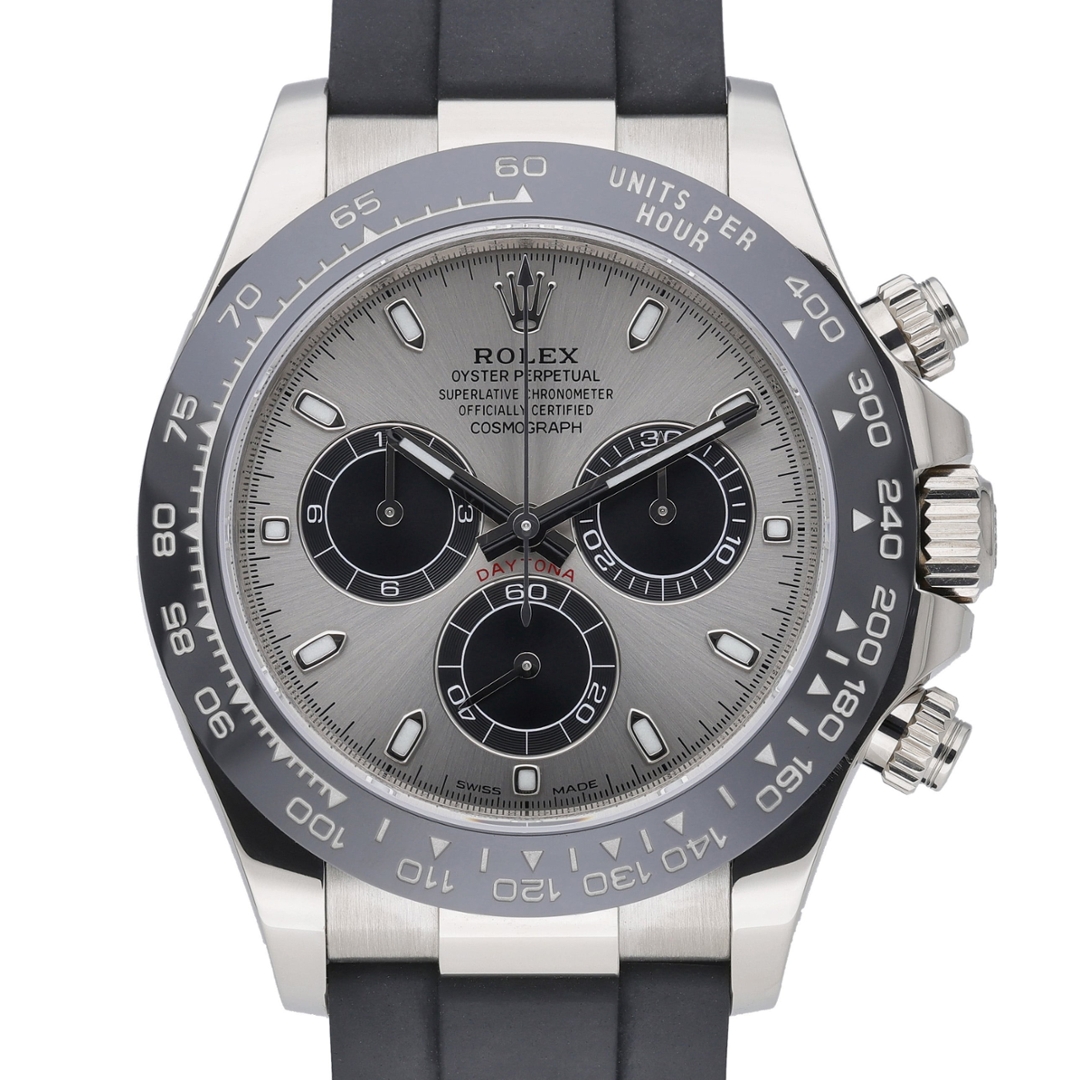 A striking example of the Rolex Daytona 116519LN, this 40mm model pairs an 18ct white gold case with the steel sunburst dial featuring contrasting black sub-dials. Combined with the black Cerachrom bezel and Oysterflex rubber strap, this configuration remains one of the most desirable modern Daytona variants, prized by collectors for its contemporary aesthetic and consistently strong market performance. Its blend of precious metal construction and sporty design has ensured enduring demand since its release.