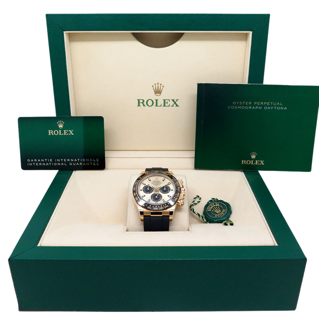 This 2023 Rolex Daytona 116518LN presents a potent combination of yellow gold construction and modern sport capability, featuring an 18ct yellow gold case and clasp paired with the black Oysterflex strap. The champagne dial offers a clean and well-balanced layout, with contrasting black sub-dials that enhance legibility, while the black Cerachrom bezel provides durability and a contemporary finish. At 40mm, it delivers a versatile and wearable profile suited to daily use.