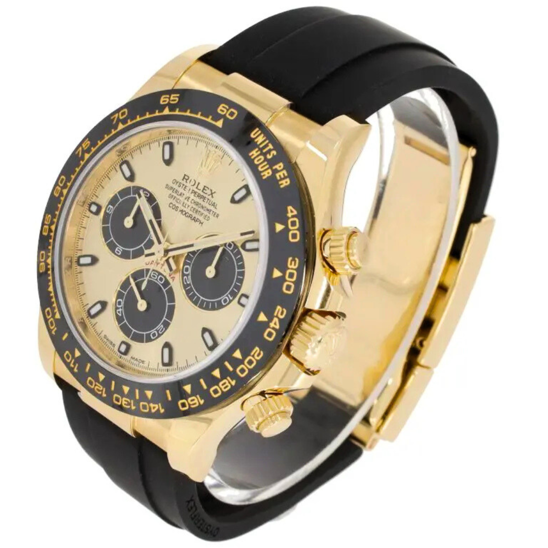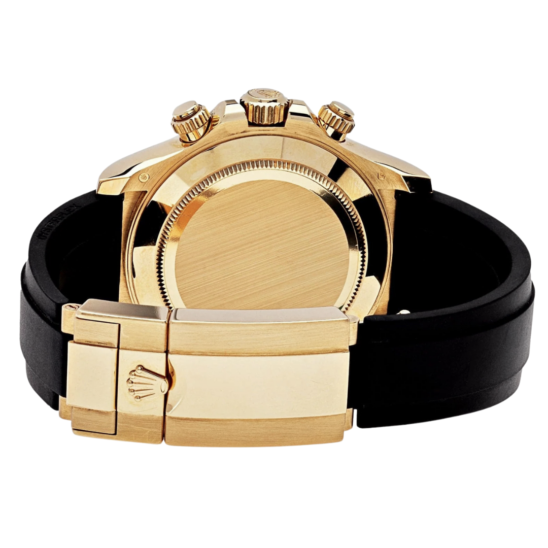 A Rolex Daytona Watch, 18ct Yellow Gold Case & Clasp with a Black Rubber Strap and a Black Bezel on a Champagne Dial.