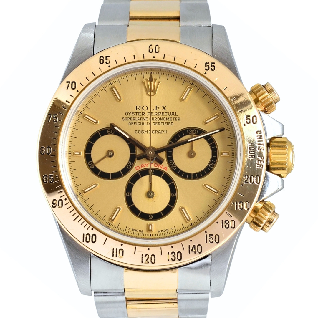 A Bi-Metal Rolex Daytona Watch, Stainless Steel & 18ct Yellow Gold on a Champagne Dial. This 1991 reference 16523 is from the highly sought-after Zenith-powered era, featuring a 40mm case, an iconic champagne dial, and contrasting black sub-dials. Crucially, this example features the desirable inverted six at the 6 o’clock sub-dial — a signature trait of early Zenith Daytonas and an increasingly important marker of collectability. Its steel-and-yellow-gold construction gives the watch a classic Daytona presence, complemented by the engraved tachymeter bezel and unmistakable Oyster aesthetics.