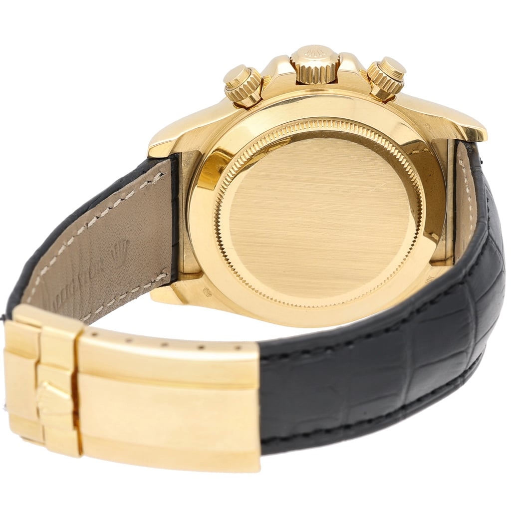 A Rolex Daytona Watch, Black Leather Strap with an 18ct Yellow Gold Case & Clasp on a White Dial with Original Rolex Diamonds.