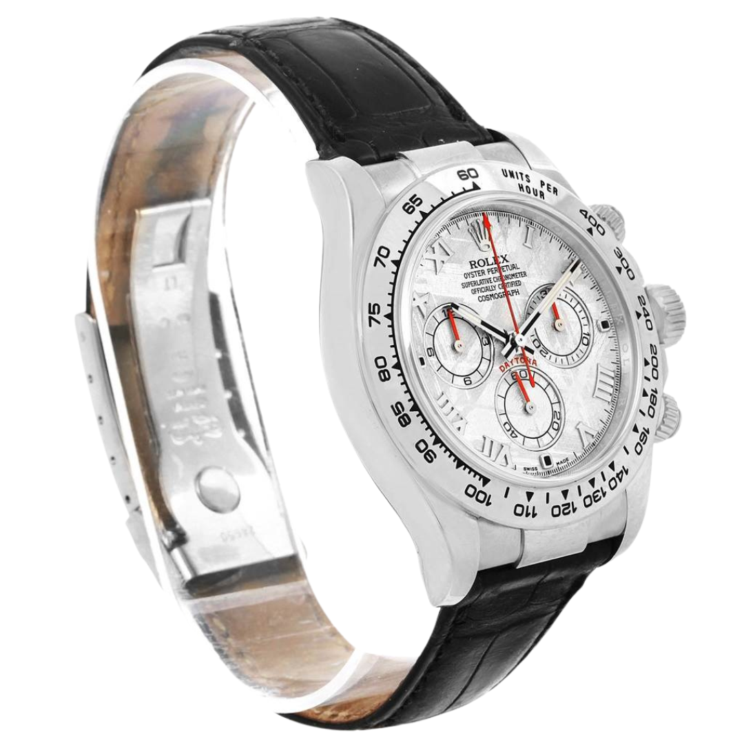 This Rolex Daytona 116519 represents one of the most compelling modern precious-metal Daytonas, pairing an 18ct white gold case with the highly coveted meteorite dial. Each meteorite dial is naturally unique, formed from an extraterrestrial iron-nickel structure, making no two examples identical and adding a genuine rarity factor that continues to attract long-term collectors.