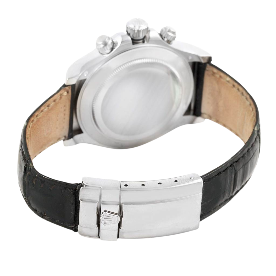 Housed within the 40mm case is Rolex’s in-house Calibre 4130 automatic chronograph movement, celebrated for its reliability, efficiency, and long-term serviceability. The white gold tachymeter bezel and contrasting black leather strap deliver a discreet, understated aesthetic that appeals to collectors seeking precious metal without overt flash.
