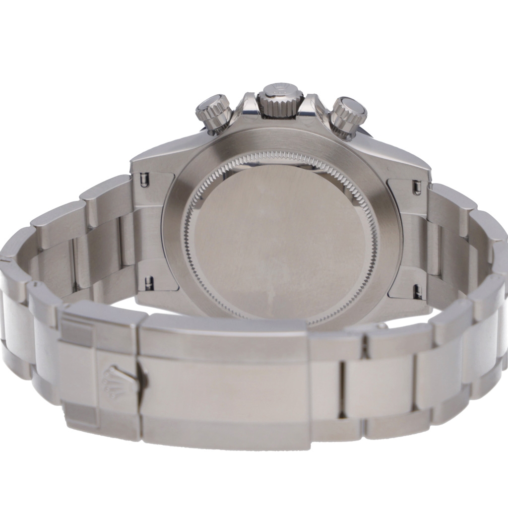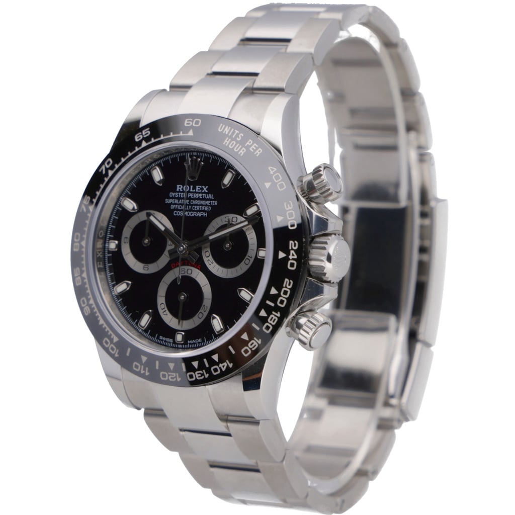 A Rolex Daytona is one of the most sought-after modern chronographs, presented in stainless steel with a black Cerachrom bezel and matching black dial. The 40mm Oyster case offers perfectly balanced proportions, combining sporty presence with refined finishing. The dial layout is clean and instantly recognisable, featuring contrasting chronograph sub-dials, luminous hour markers, and polished hands, while the engraved tachymeter bezel reinforces the Daytona’s motorsport heritage.