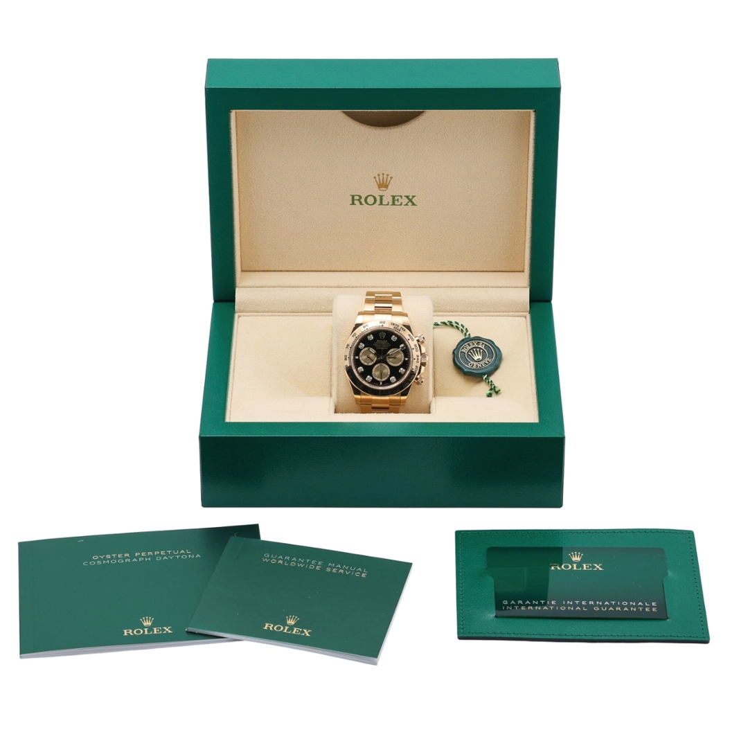 A Rolex Cosmograph Daytona is presented in full 18ct yellow gold, showcasing the brand’s most iconic chronograph design in its current-generation form. The 40mm Oyster case is paired with a matching yellow gold Oyster bracelet and fixed tachymeter bezel, delivering a bold yet refined profile that remains unmistakably Daytona. The black dial provides sharp contrast, enhanced by factory-set diamond hour markers and classic champagne sub-dials, with the red “Daytona” script completing the signature layout.